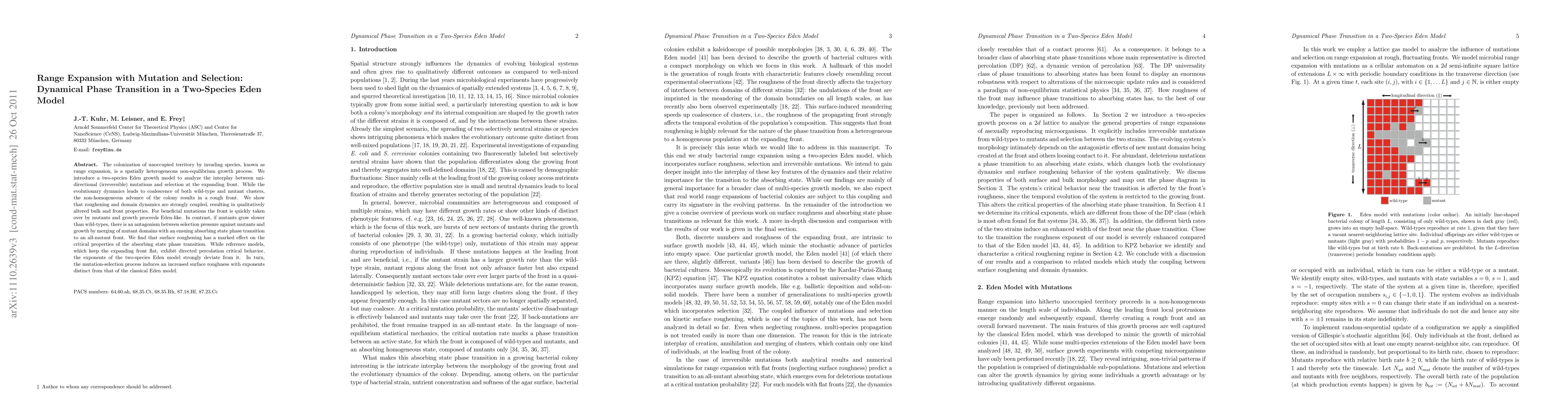This paper investigates range expansion in a two-species Eden model, focusing on the interplay between mutations and selection during colonization. It reveals a dynamical phase transition influenced by the growth dynamics and mutation rates, leading to distinct critical behaviors and surface roughening compared to traditional models.