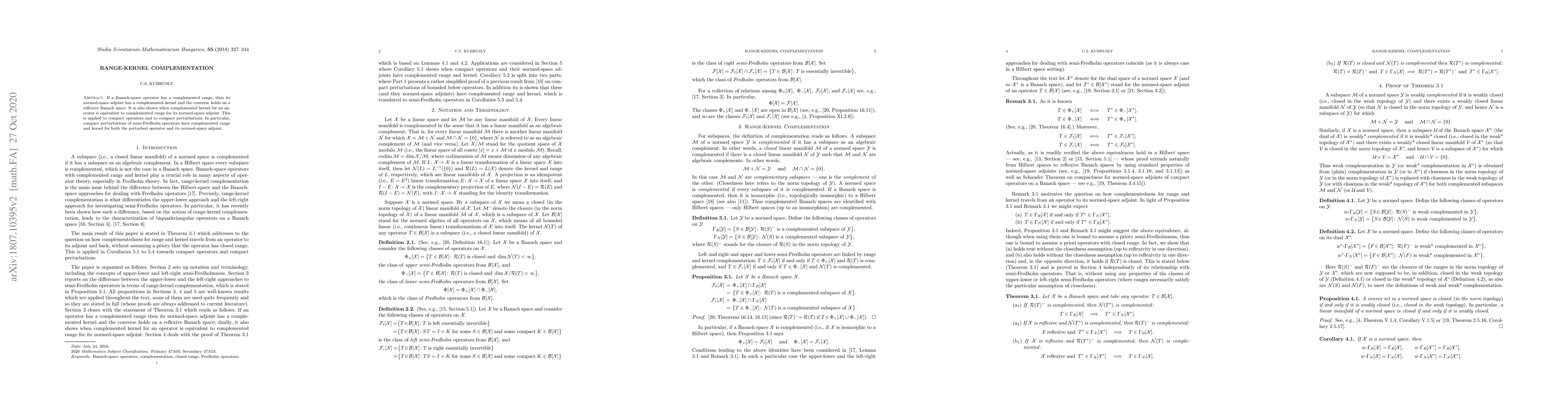 If a Banach-space operator has a complemented range, then its normed-space adjoint has a complemented kernel and the converse holds on a reflexive Banach space. It is also shown when complemented kernel for an operator is equivalent to complemented range for its normed-space adjoint. This is applied to compact operators and to compact perturbations. In particular, compact perturbations of semi-Fredholm operators have complemented range and kernel for both the perturbed operator and its normed-space adjoint