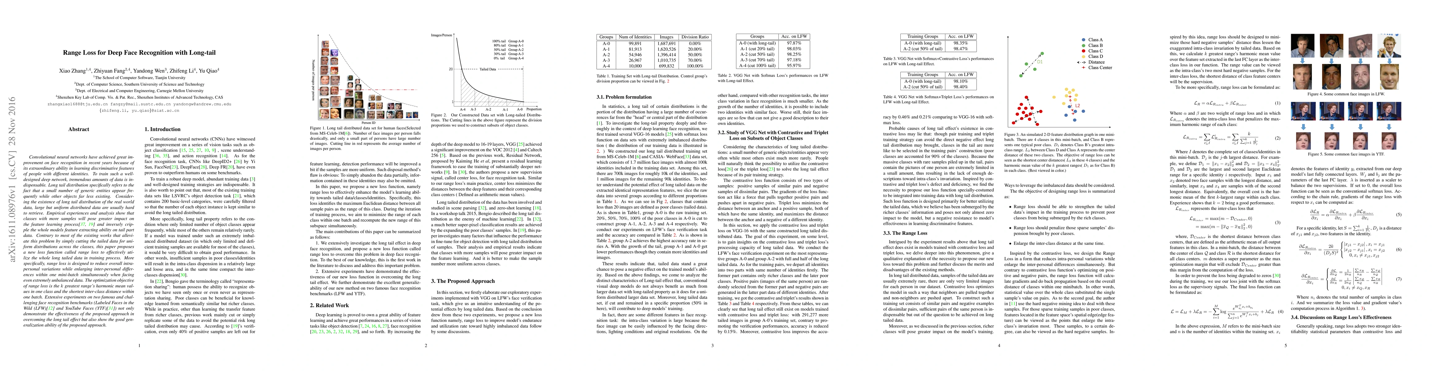 Convolutional neural networks have achieved great improvement on face recognition in recent years because of its extraordinary ability in learning discriminative features of people with different identities. To train such a well-designed deep network, tremendous amounts of data is indispensable. Long tail distribution specifically refers to the fact that a small number of generic entities appear frequently while other objects far less existing. Considering the existence of long tail distribution of the real world data, large but uniform distributed data are usually hard to retrieve. Empirical experiences and analysis show that classes with more samples will pose greater impact on the feature learning process and inversely cripple the whole models feature extracting ability on tail part data. Contrary to most of the existing works that alleviate this problem by simply cutting the tailed data for uniform distributions across the classes, this paper proposes a new loss function called range loss to effectively utilize the whole long tailed data in training process. More specifically, range loss is designed to reduce overall intra-personal variations while enlarging inter-personal differences within one mini-batch simultaneously when facing even extremely unbalanced data. The optimization objective of range loss is the $k$ greatest range's harmonic mean values in one class and the shortest inter-class distance within one batch. Extensive experiments on two famous and challenging face recognition benchmarks (Labeled Faces in the Wild (LFW) and YouTube Faces (YTF) not only demonstrate the effectiveness of the proposed approach in overcoming the long tail effect but also show the good generalization ability of the proposed approach.