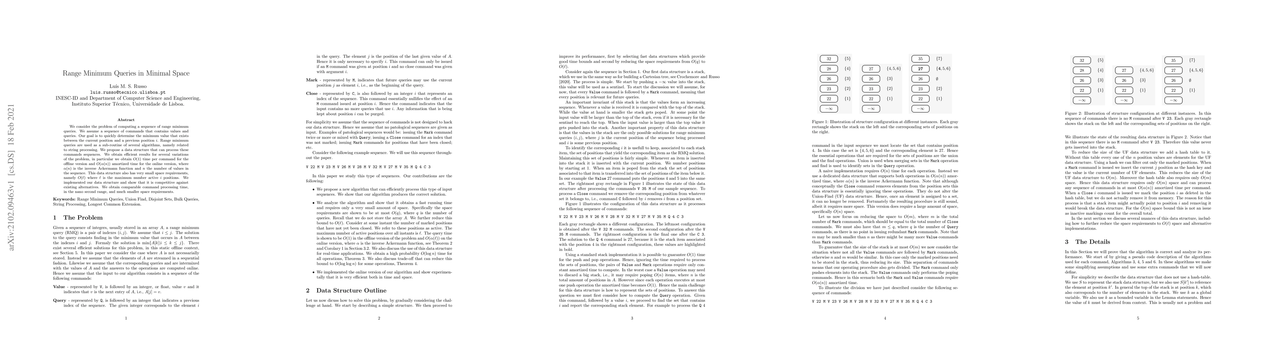 We consider the problem of computing a sequence of range minimum queries. We assume a sequence of commands that contains values and queries. Our goal is to quickly determine the minimum value that exists between the current position and a previous position $i$. Range minimum queries are used as a sub-routine of several algorithms, namely related to string processing. We propose a data structure that can process these commands sequences. We obtain efficient results for several variations of the problem, in particular we obtain $O(1)$ time per command for the offline version and $O(\alpha(n))$ amortized time for the online version, where $\alpha(n)$ is the inverse Ackermann function and $n$ the number of values in the sequence. This data structure also has very small space requirements, namely $O(\ell)$ where $\ell$ is the maximum number active $i$ positions. We implemented our data structure and show that it is competitive against existing alternatives. We obtain comparable command processing time, in the nano second range, and much smaller space requirements.