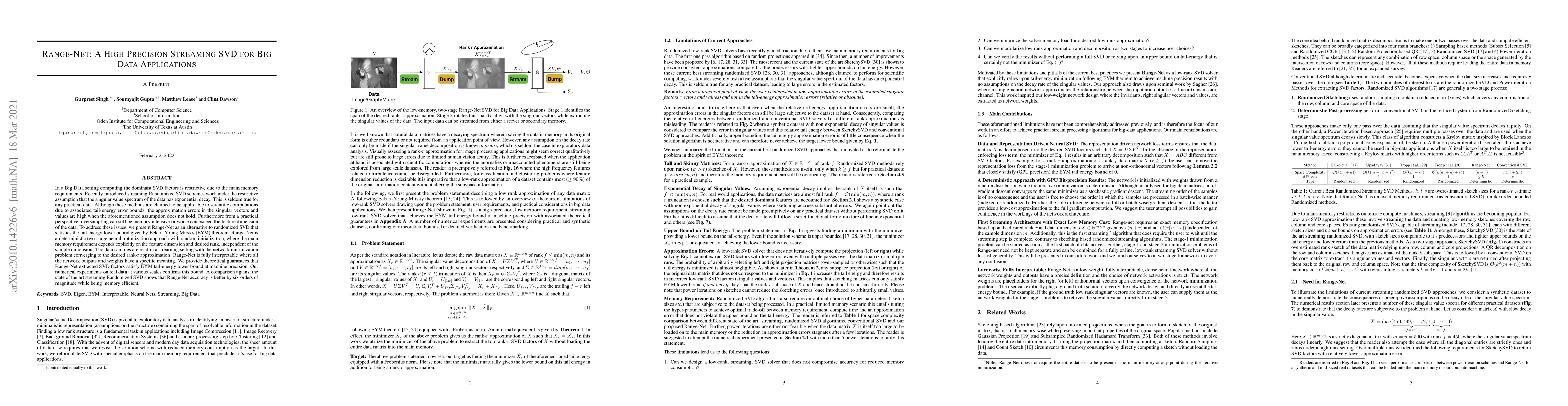Range-Net is a new method for computing SVD factors in big data applications that offers high precision with low memory requirements. It outperforms existing streaming SVD schemes by six orders of magnitude while being interpretable and satisfying theoretical guarantees.