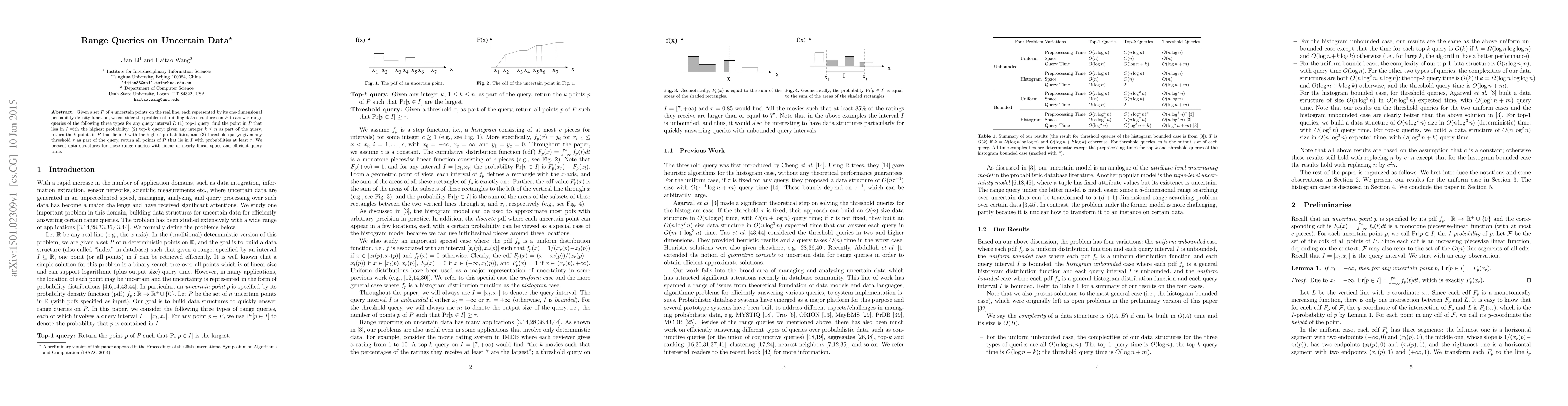 This paper presents data structures for efficiently answering range queries on uncertain data represented by one-dimensional probability density functions. The structures support top-1, top-k, and threshold queries with linear or nearly linear space complexity and efficient query times.