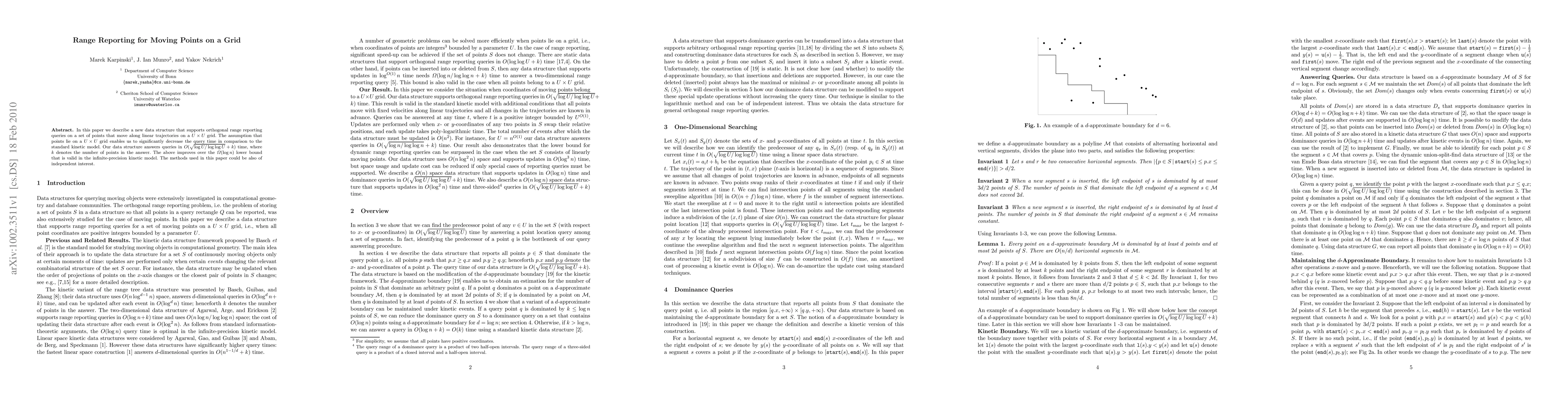 In this paper we describe a new data structure that supports orthogonal range reporting queries on a set of points that move along linear trajectories on a $U\times U$ grid. The assumption that points lie on a $U\times U$ grid enables us to significantly decrease the query time in comparison to the standard kinetic model. Our data structure answers queries in $O(\sqrt{\log U/\log \log U}+k)$ time, where $k$ denotes the number of points in the answer. The above improves over the $\Omega(\log n)$ lower bound that is valid in the infinite-precision kinetic model. The methods used in this paper could be also of independent interest.