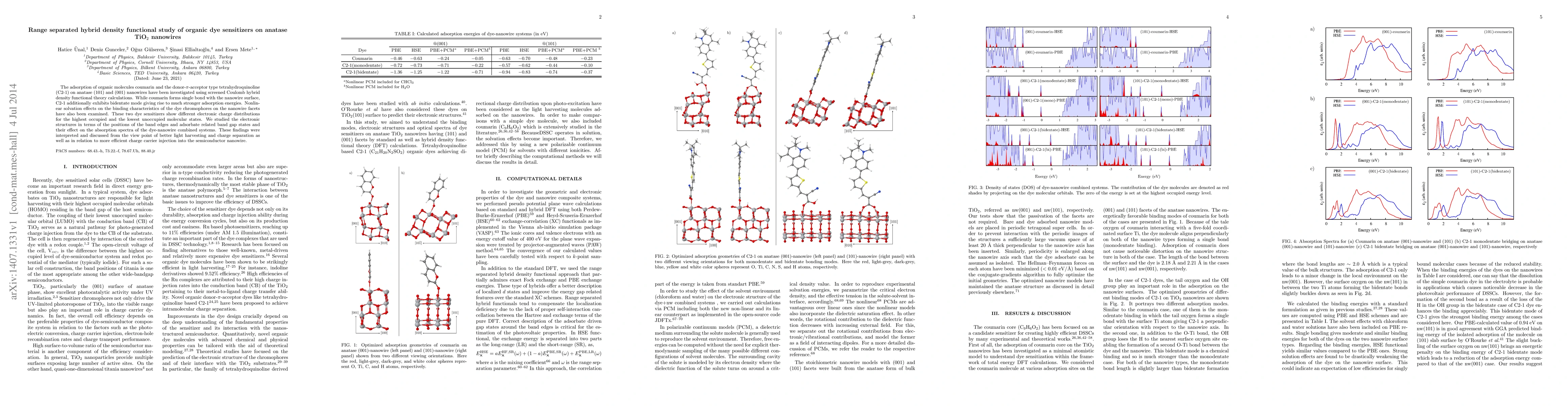 This paper investigates the adsorption of organic dyes coumarin and C2-1 on anatase TiO$_2$ nanowires using hybrid density functional theory, revealing stronger adsorption for C2-1 due to bidentate bonding, and discusses the implications for light harvesting and charge separation efficiency.