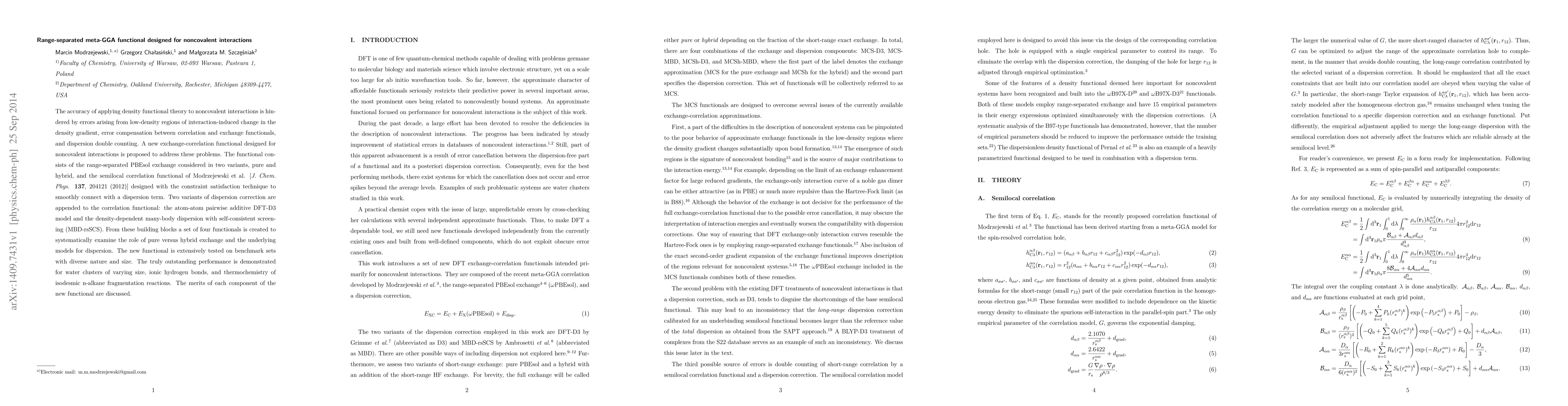 The accuracy of applying density functional theory to noncovalent interactions is hindered by errors arising from low-density regions of interaction-induced change in the density gradient, error compensation between correlation and exchange functionals, and dispersion double counting. A new exchange-correlation functional designed for noncovalent interactions is proposed to address these problems. The functional consists of the range-separated PBEsol exchange considered in two variants, pure and hybrid, and the semilocal correlation functional of Modrzejewski et al. [J. Chem. Phys. 137, 204121 (2012)] designed with the constraint satisfaction technique to smoothly connect with a dispersion term. Two variants of dispersion correction are appended to the correlation functional: the atom-atom pairwise additive DFT-D3 model and the density-dependent many-body dispersion with self-consistent screening (MBD-rsSCS). From these building blocks a set of four functionals is created to systematically examine the role of pure versus hybrid exchange and the underlying models for dispersion. The new functional is extensively tested on benchmark sets with diverse nature and size. The truly outstanding performance is demonstrated for water clusters of varying size, ionic hydrogen bonds, and thermochemistry of isodesmic n-alkane fragmentation reactions. The merits of each component of the new functional are discussed.