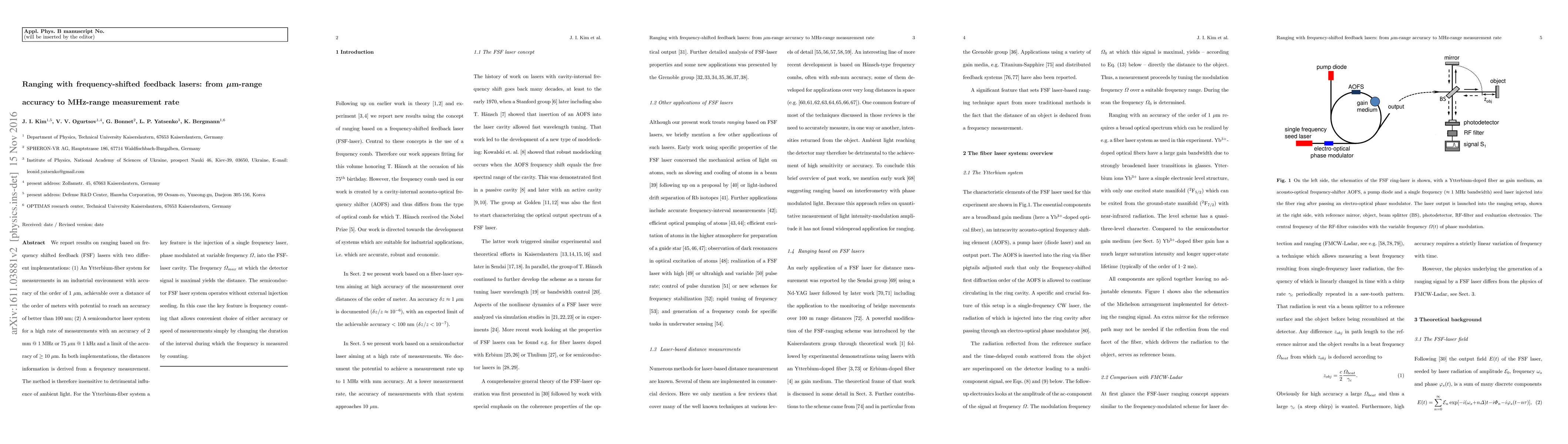 We report results on ranging based on frequency shifted feedback (FSF) lasers with two different implementations: (1) An Ytterbium-fiber system for measurements in an industrial environment with accuracy of the order of 1 $\mu$m, achievable over a distance of the order of meters with potential to reach an accuracy of better than 100 nm; (2) A semiconductor laser system for a high rate of measurements with an accuracy of 2 mm @ 1 MHz or 75 $\mu$m @ 1 kHz and a limit of the accuracy of $\geq $ 10 $\mu$m. In both implementations, the distances information is derived from a frequency measurement. The method is therefore insensitive to detrimental influence of ambient light. For the Ytterbium-fiber system a key feature is the injection of a single frequency laser, phase modulated at variable frequency $\Omega$, into the FSF-laser cavity. The frequency $\Omega_{max}$ at which the detector signal is maximal yields the distance. The semiconductor FSF laser system operates without external injection seeding. In this case the key feature is frequency counting that allows convenient choice of either accuracy or speed of measurements simply by changing the duration of the interval during which the frequency is measured by counting.