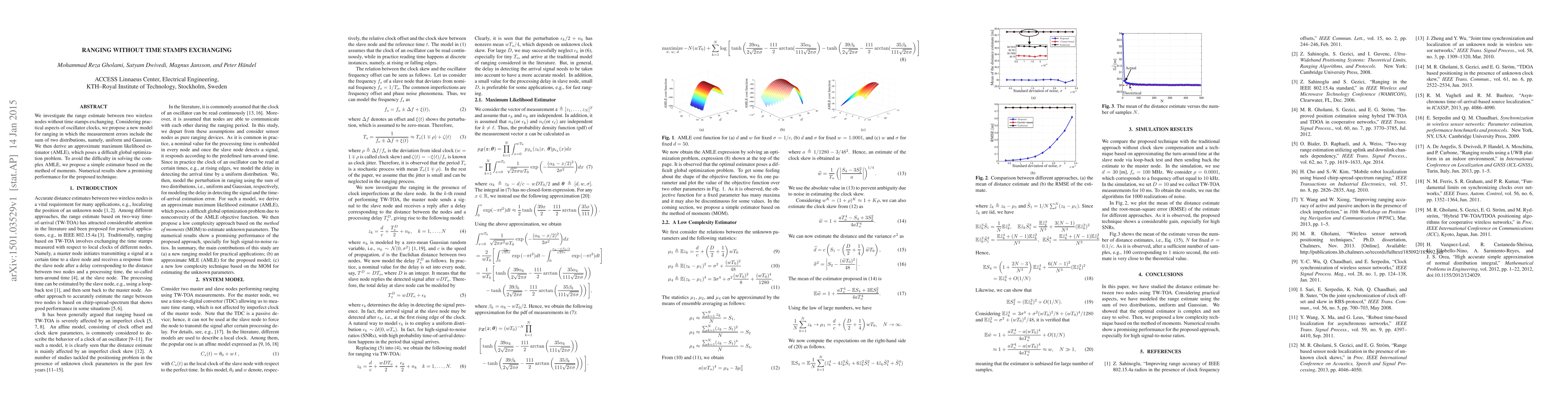 We investigate the range estimate between two wireless nodes without time stamps exchanging. Considering practical aspects of oscillator clocks, we propose a new model for ranging in which the measurement errors include the sum of two distributions, namely, uniform and Gaussian. We then derive an approximate maximum likelihood estimator (AMLE), which poses a difficult global optimization problem. To avoid the difficulty in solving the complex AMLE, we propose a simple estimator based on the method of moments. Numerical results show a promising performance for the proposed technique.