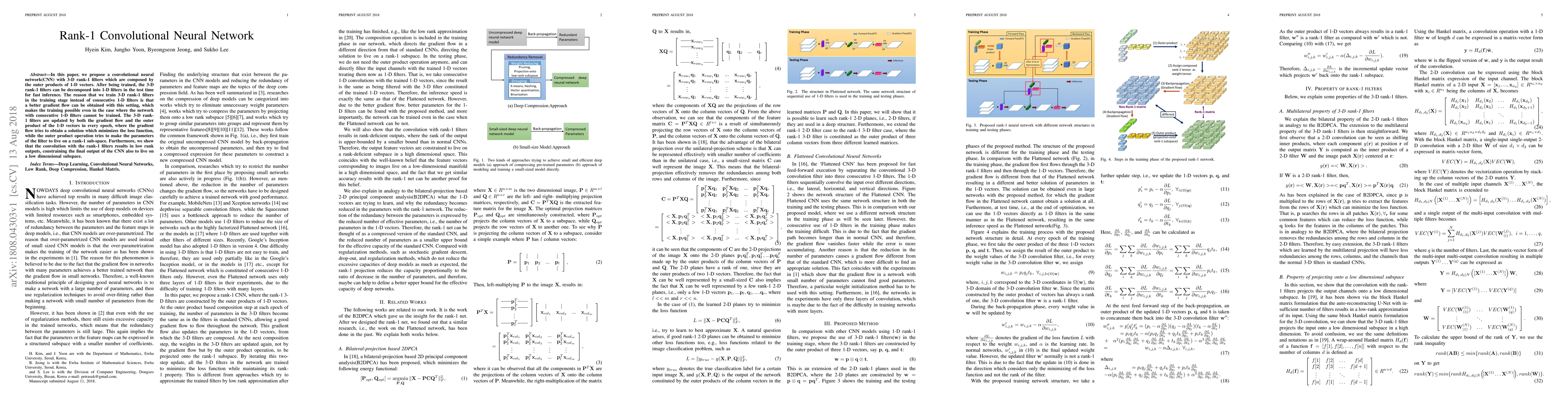 This paper introduces a Rank-1 Convolutional Neural Network (CNN) using 3-D filters constructed from 1-D filters' outer product. These 3-D filters can be separated into 1-D filters for quicker inference post-training. The key methodological advantage lies in the better gradient flow during training, enabling solutions where standard 1-D filter networks fail. The filters' updates maintain rank-1 constraints, and the convolution results in low-rank outputs, thus confining the CNN's final output to lower dimensional subspaces.