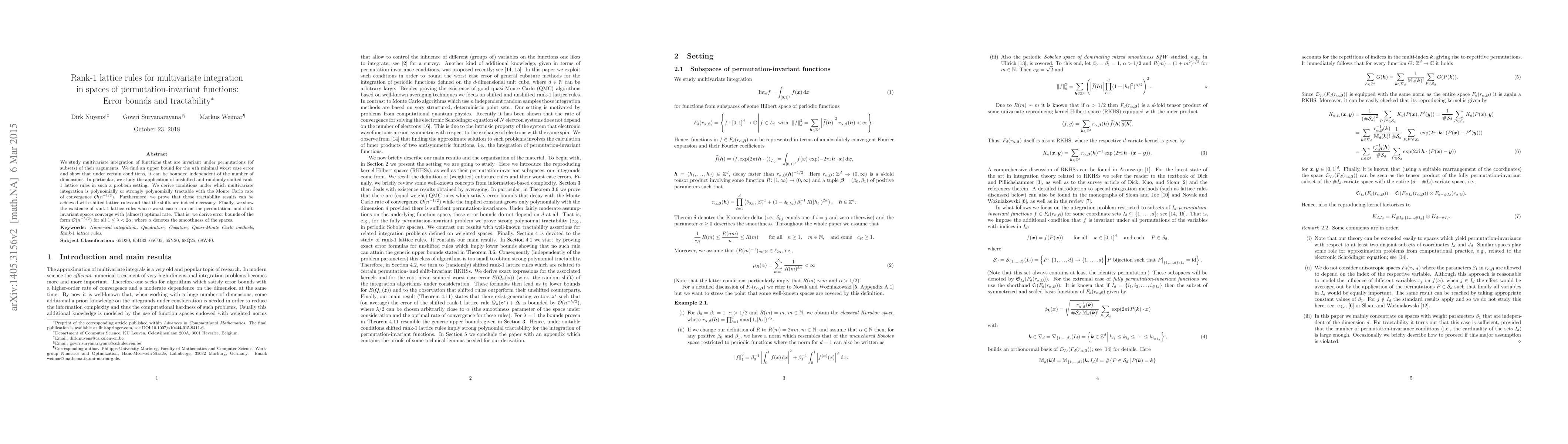 We study multivariate integration of functions that are invariant under permutations (of subsets) of their arguments. We find an upper bound for the $n$th minimal worst case error and show that under certain conditions, it can be bounded independent of the number of dimensions. In particular, we study the application of unshifted and randomly shifted rank-$1$ lattice rules in such a problem setting. We derive conditions under which multivariate integration is polynomially or strongly polynomially tractable with the Monte Carlo rate of convergence $O(n^{-1/2})$. Furthermore, we prove that those tractability results can be achieved with shifted lattice rules and that the shifts are indeed necessary. Finally, we show the existence of rank-$1$ lattice rules whose worst case error on the permutation- and shift-invariant spaces converge with (almost) optimal rate. That is, we derive error bounds of the form $O(n^{-\lambda/2})$ for all $1 \leq \lambda < 2 \alpha$, where $\alpha$ denotes the smoothness of the spaces. Keywords: Numerical integration, Quadrature, Cubature, Quasi-Monte Carlo methods, Rank-1 lattice rules.