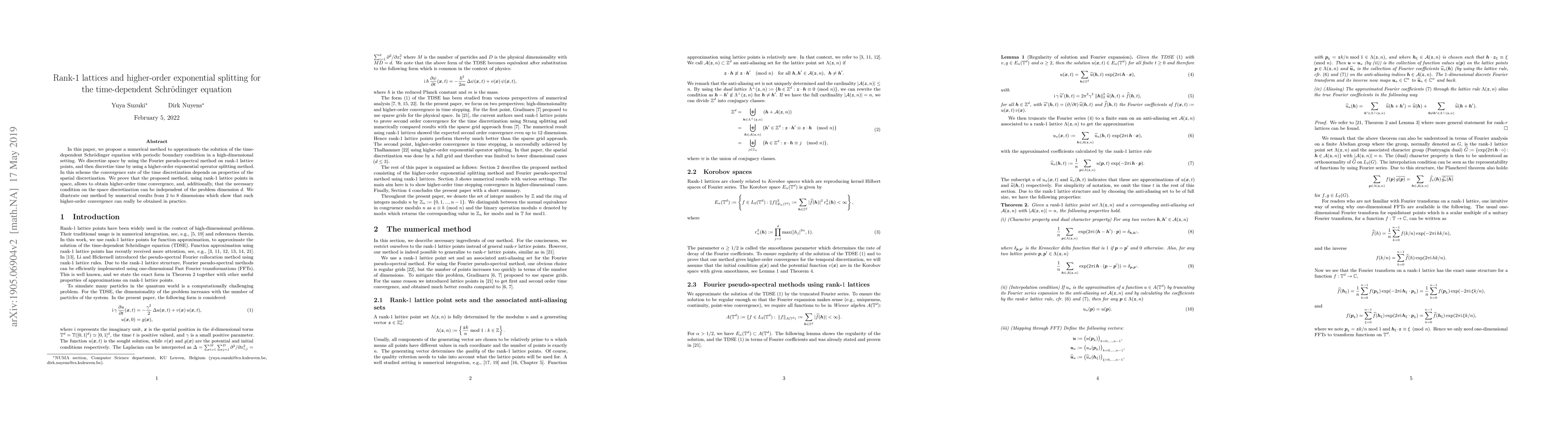 This paper introduces a numerical method for solving the time-dependent Schrödinger equation using rank-1 lattices and higher-order exponential splitting. The method achieves higher-order time convergence independent of the problem dimension, as demonstrated by numerical results in dimensions ranging from 2 to 8.
