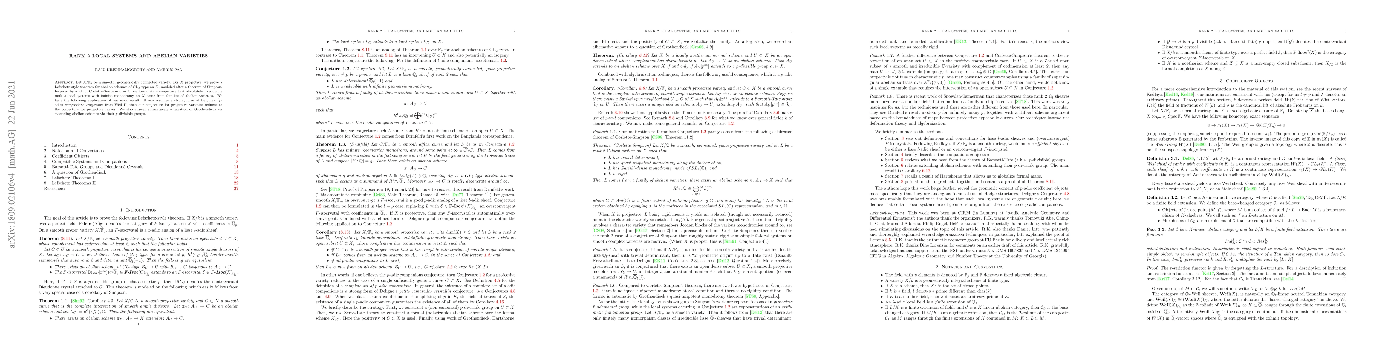 The paper formulates a conjecture that absolutely irreducible rank 2 local systems with infinite monodromy on a smooth geometrically connected variety X over a finite field come from families of abelian varieties. The authors prove a Lefschetz-style theorem for abelian schemes of GL_2-type on X when X is projective, assuming a strong form of Deligne's (p-adic) companions conjecture from Weil II.