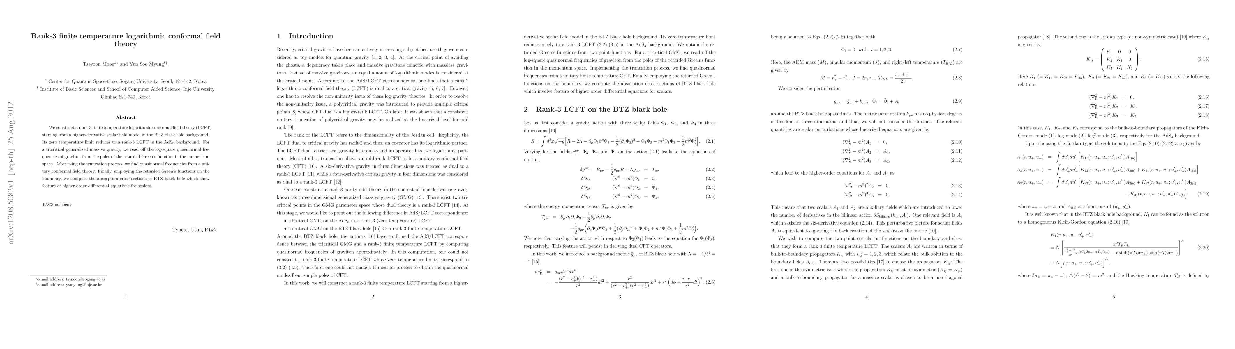 We construct a rank-3 finite temperature logarithmic conformal field theory (LCFT) starting from a higher-derivative scalar field model in the BTZ black hole background. Its zero temperature limit reduces to a rank-3 LCFT in the AdS$_3$ background. For a tricritical generalized massive gravity, we read off the log-square quasinormal frequencies of graviton from the poles of the retarded Green's function in the momentum space. After using the truncation process, we find quasinormal frequencies from a unitary conformal field theory. Finally, employing the retarded Green's functions on the boundary, we compute the absorption cross sections of BTZ black hole which show feature of higher-order differential equations for scalars.