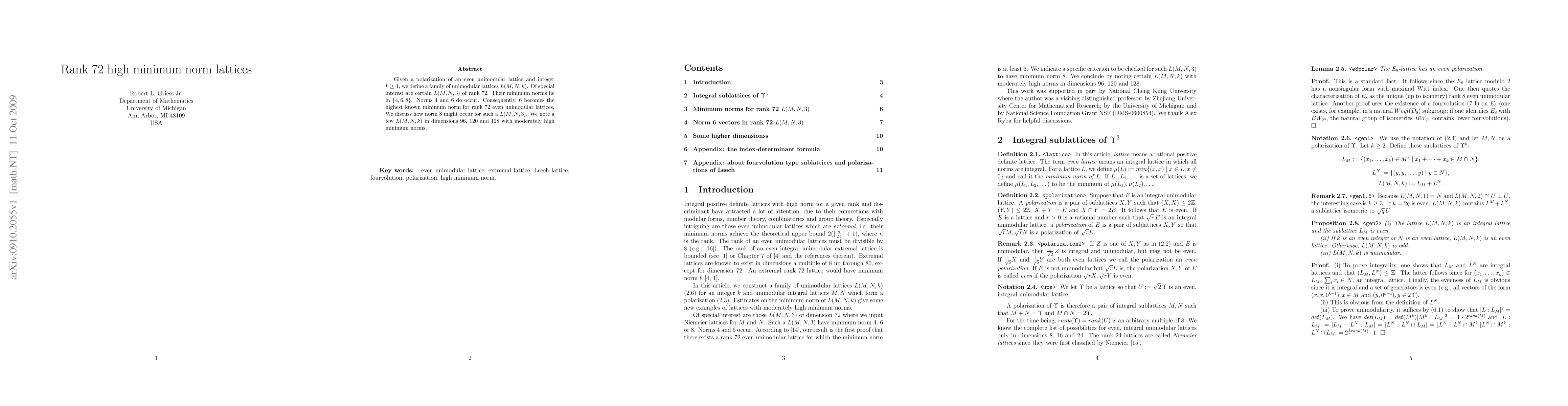 This paper explores unimodular lattices $L(M,N,k)$ derived from a given polarization, focusing on rank 72 lattices with minimum norms of 4, 6, or 8. It establishes that norm 6 is the highest known minimum for rank 72 lattices, and discusses the potential for norm 8 occurrences. Additionally, it mentions lattices of higher ranks with moderately high minimum norms.