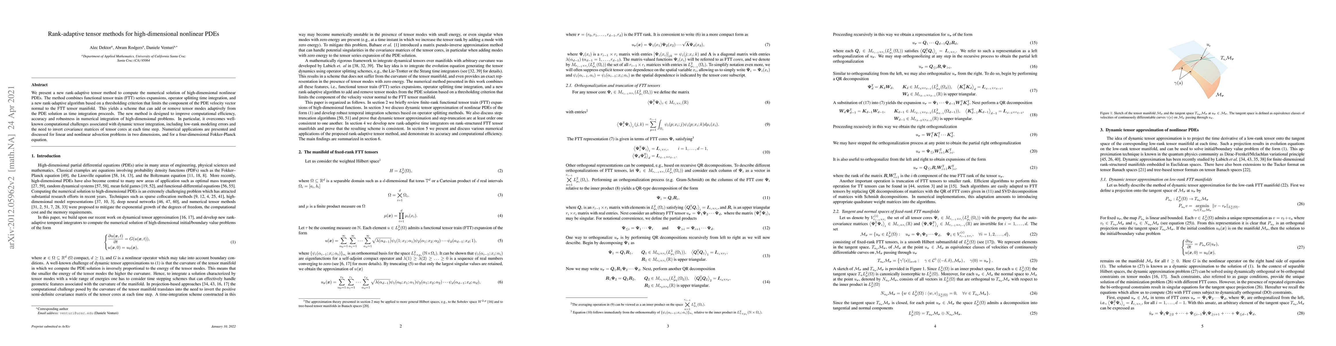 The research introduces a rank-adaptive tensor method for high-dimensional nonlinear PDEs, combining FTT series expansions, operator splitting time integration, and a novel rank-adaptive algorithm based on a thresholding criterion.