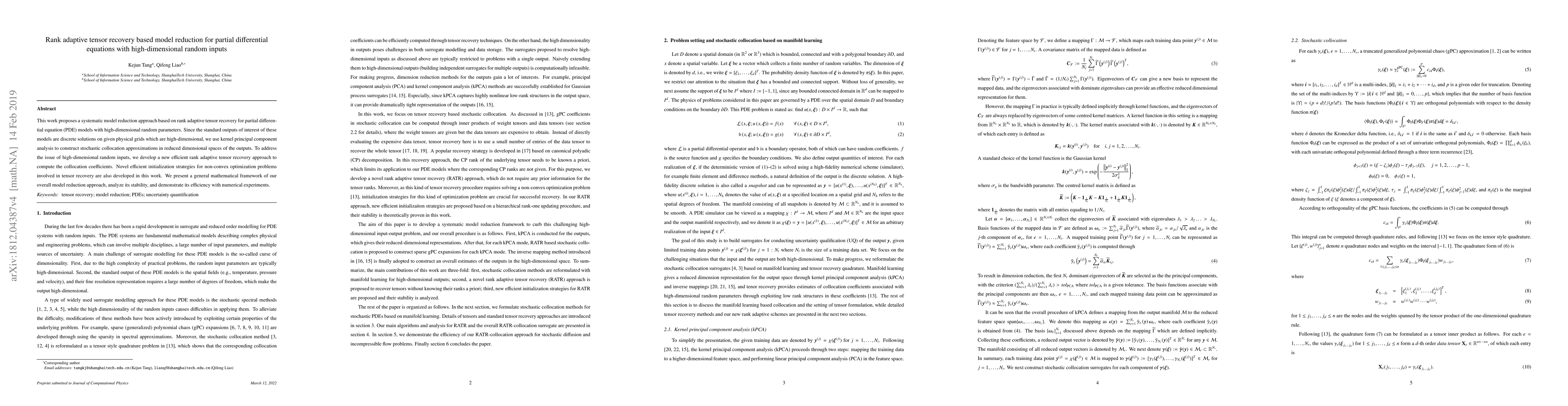 This paper introduces a rank adaptive tensor recovery method for reducing the complexity of PDE models with high-dimensional random inputs. It employs kernel principal component analysis and stochastic collocation to construct reduced-dimensional output approximations, and presents efficient initialization strategies for tensor recovery optimization.