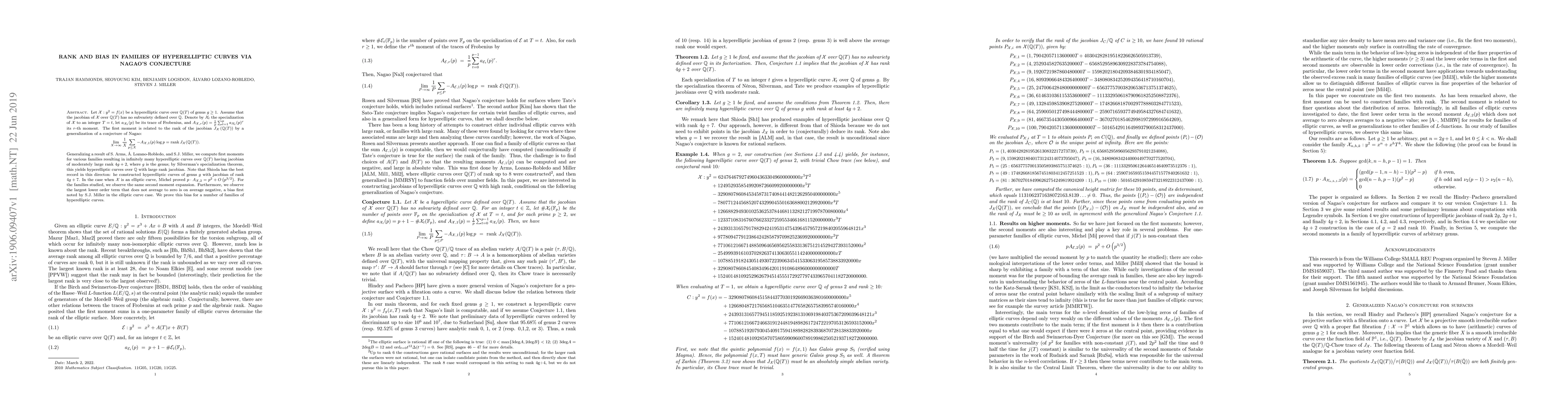 Let $\mathcal{X} : y^2 = f(x)$ be a hyperelliptic curve over $\mathbb{Q}(T)$ of genus $g\geq 1$. Assume that the jacobian of $\mathcal{X}$ over $\mathbb{Q}(T)$ has no subvariety defined over $\mathbb{Q}$. Denote by $\mathcal{X}_t$ the specialization of $\mathcal{X}$ to an integer $T=t$, let $a_{\mathcal{X}_t}(p)$ be its trace of Frobenius, and $A_{\mathcal{X},r}(p) = \frac{1}{p}\sum_{t=1}^p a_{\mathcal{X}_t}(p)^r$ its $r$-th moment. The first moment is related to the rank of the jacobian $J_\mathcal{X}\left(\mathbb{Q}(T)\right)$ by a generalization of a conjecture of Nagao: $$\lim_{X \to \infty} \frac{1}{X} \sum_{p \leq X} - A_{\mathcal{X},1}(p) \log p = \operatorname{rank} J_\mathcal{X}(\mathbb{Q}(T)).$$ Generalizing a result of S. Arms, \'A. Lozano-Robledo, and S.J. Miller, we compute first moments for various families resulting in infinitely many hyperelliptic curves over $\mathbb{Q}(T)$ having jacobian of moderately large rank $4g+2$, where $g$ is the genus; by Silverman's specialization theorem, this yields hyperelliptic curves over $\mathbb{Q}$ with large rank jacobian. Note that Shioda has the best record in this directon: he constructed hyperelliptic curves of genus $g$ with jacobian of rank $4g+7$. In the case when $\mathcal{X}$ is an elliptic curve, Michel proved $p\cdot A_{\mathcal{X},2} = p^2 + O\left(p^{3/2}\right)$. For the families studied, we observe the same second moment expansion. Furthermore, we observe the largest lower order term that does not average to zero is on average negative, a bias first noted by S.J. Miller in the elliptic curve case. We prove this bias for a number of families of hyperelliptic curves.