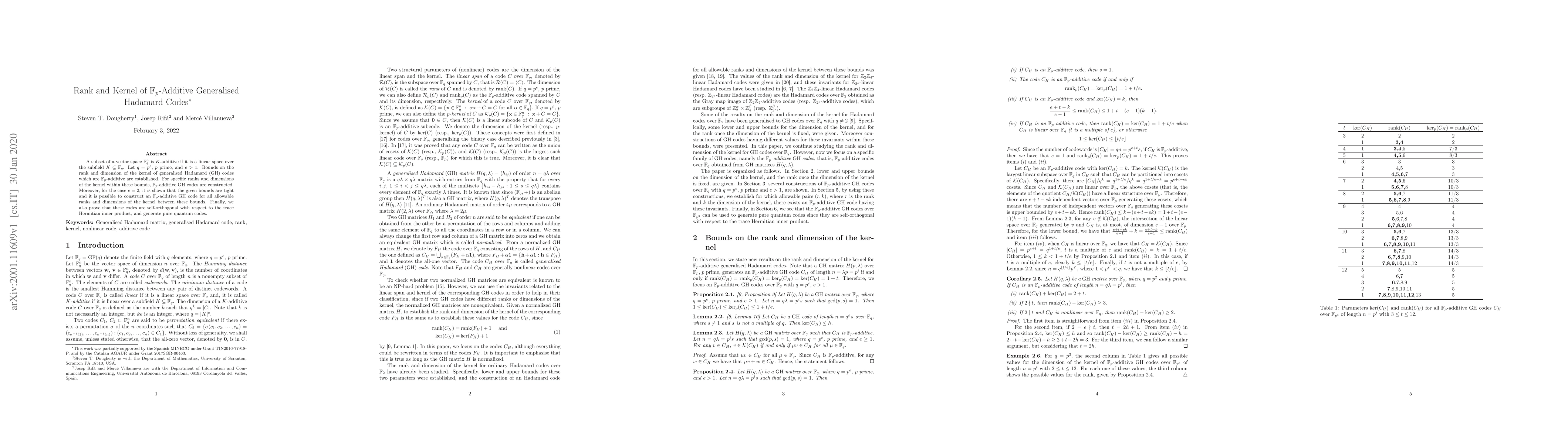 A subset of a vector space $\mathbb{F}_q^n$ is $K$-additive if it is a linear space over the subfield $K\subseteq \mathbb{F}_q$. Let $q=p^e$, $p$ prime, and $e>1$. Bounds on the rank and dimension of the kernel of generalised Hadamard (GH) codes which are $\mathbb{F}_p$-additive are established. For specific ranks and dimensions of the kernel within these bounds, $\mathbb{F}_p$-additive GH codes are constructed. Moreover, for the case $e=2$, it is shown that the given bounds are tight and it is possible to construct an $\mathbb{F}_p$-additive GH code for all allowable ranks and dimensions of the kernel between these bounds. Finally, we also prove that these codes are self-orthogonal with respect to the trace Hermitian inner product, and generate pure quantum codes.