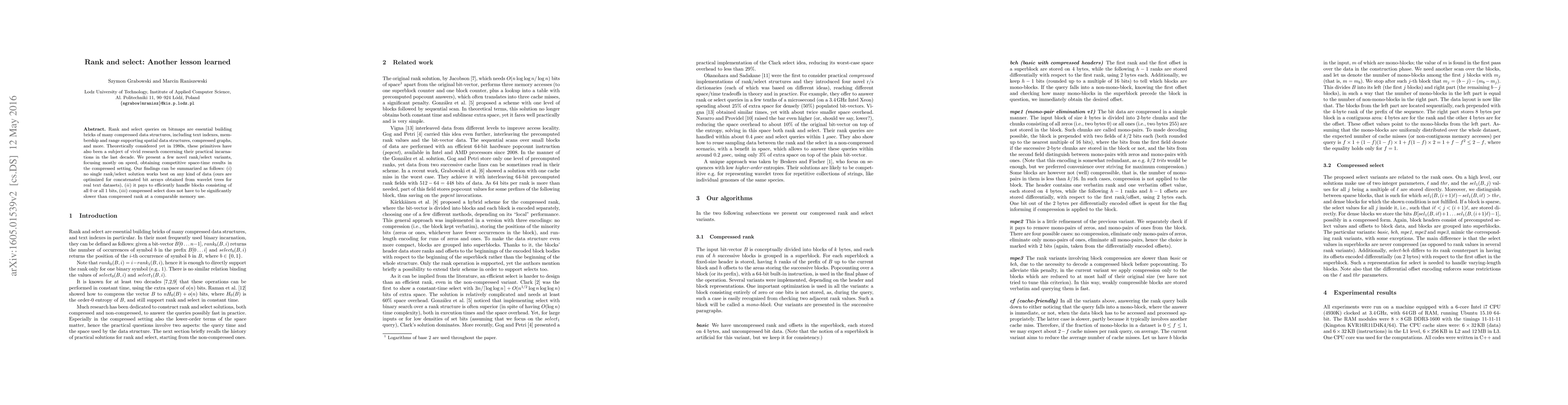 This paper introduces new rank/select variants optimized for speed and competitive space-time results in compressed data structures. Key findings include: no single solution is universally best, efficient handling of all 0 or all 1 blocks is crucial, and compressed select can be comparably fast to compressed rank.