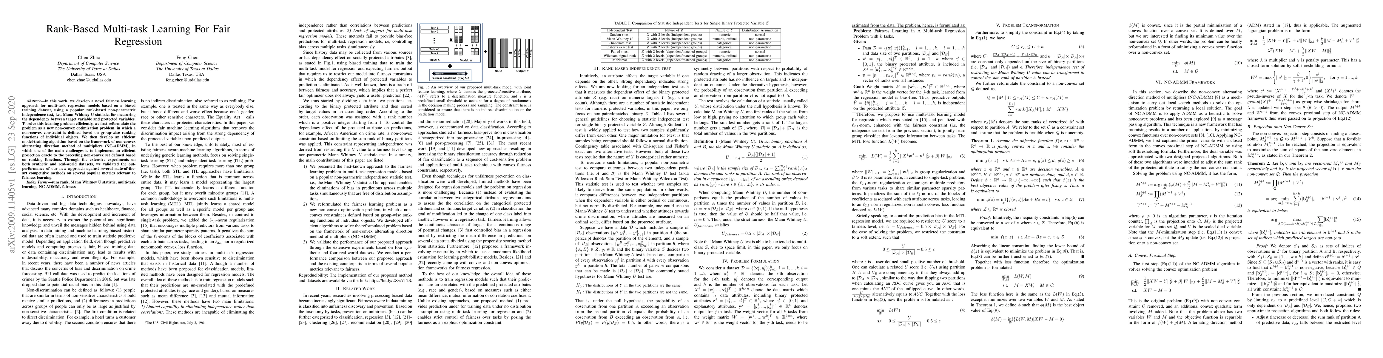 In this work, we develop a novel fairness learning approach for multi-task regression models based on a biased training dataset, using a popular rank-based non-parametric independence test, i.e., Mann Whitney U statistic, for measuring the dependency between target variable and protected variables. To solve this learning problem efficiently, we first reformulate the problem as a new non-convex optimization problem, in which a non-convex constraint is defined based on group-wise ranking functions of individual objects. We then develop an efficient model-training algorithm based on the framework of non-convex alternating direction method of multipliers (NC-ADMM), in which one of the main challenges is to implement an efficient projection oracle to the preceding non-convex set defined based on ranking functions. Through the extensive experiments on both synthetic and real-world datasets, we validated the out-performance of our new approach against several state-of-the-art competitive methods on several popular metrics relevant to fairness learning.
