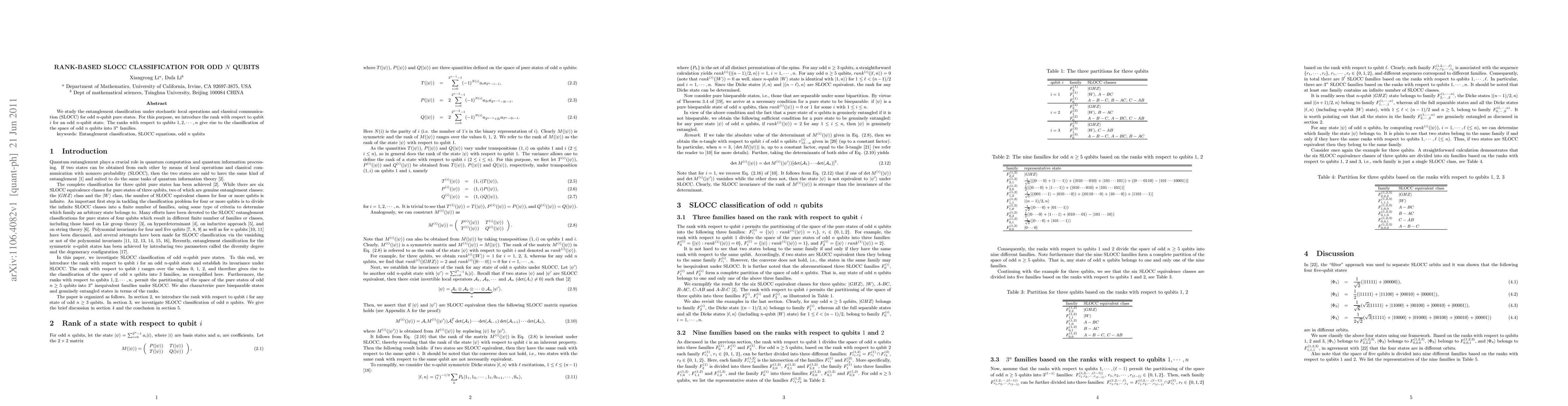 This paper introduces a rank-based method for classifying entanglement in odd n-qubit pure states under stochastic local operations and classical communication (SLOCC), resulting in a 3^n family classification based on ranks with respect to each qubit.