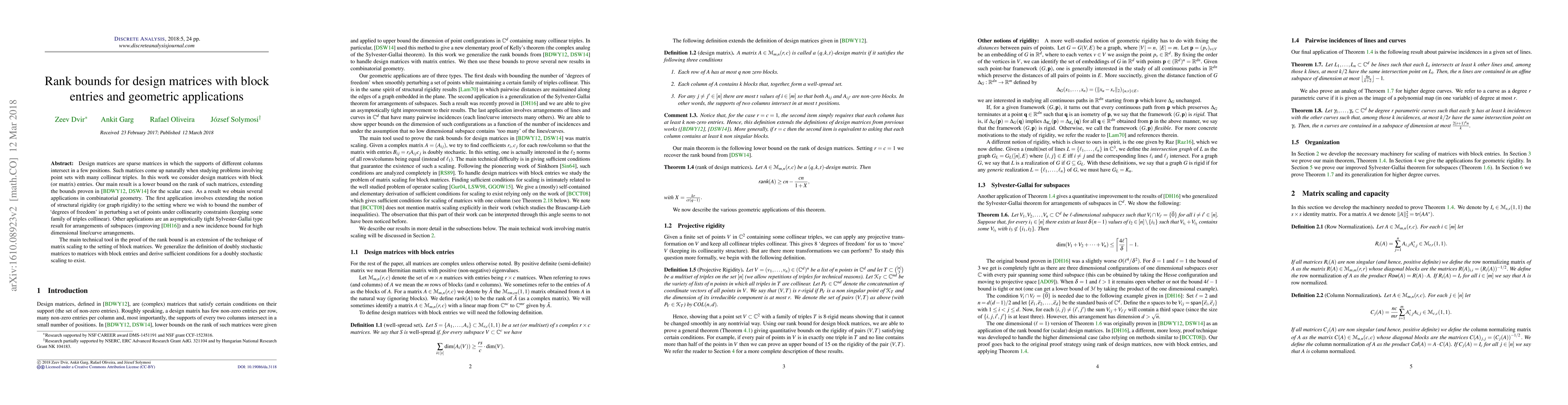 This paper provides a lower bound on the rank of design matrices with block entries, extending previous scalar bounds, and applies this to combinatorial geometry, including structural rigidity and incidence bounds for high-dimensional arrangements. The key technical contribution is the extension of matrix scaling techniques to block matrices.