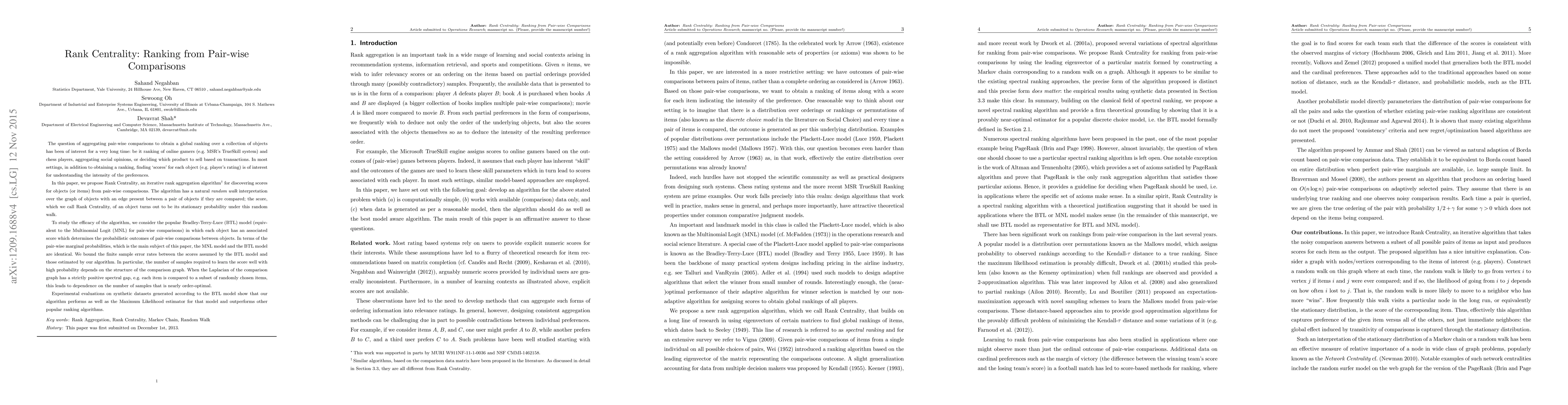 This paper proposes Rank Centrality, an iterative algorithm for ranking objects from pair-wise comparisons and estimating their scores. It interprets the rank as the stationary probability of a random walk over the comparison graph, and analyzes its performance relative to the Bradley-Terry-Luce model, showing nearly optimal sample complexity under certain graph structures.