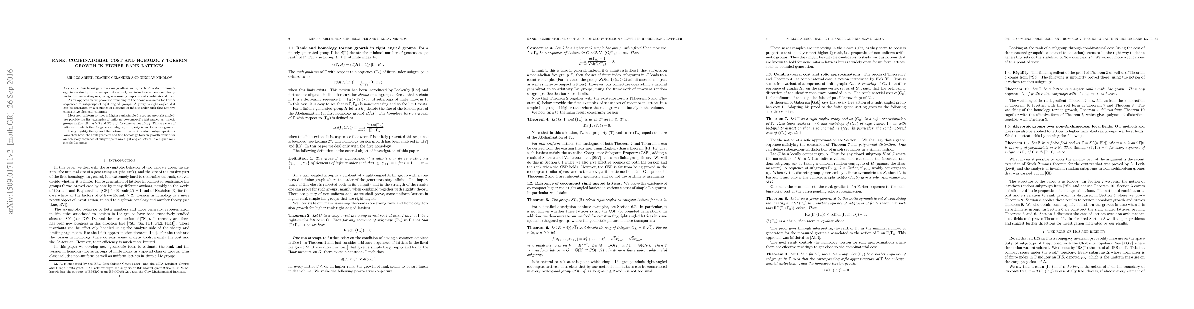 This paper explores the rank gradient and homology torsion growth in residually finite groups, introducing a new complexity notion using measured groupoids and combinatorial cost. It demonstrates vanishing invariants for Farber sequences in right angled groups and provides examples of uniform right angled arithmetic groups in $\mathrm{SL}(n,\mathbb{R})$ and $\mathrm{SO}(p,q)$, concluding that rank gradient and homology torsion growth vanish in any sequence of subgroups in right angled lattices in higher rank simple Lie groups.