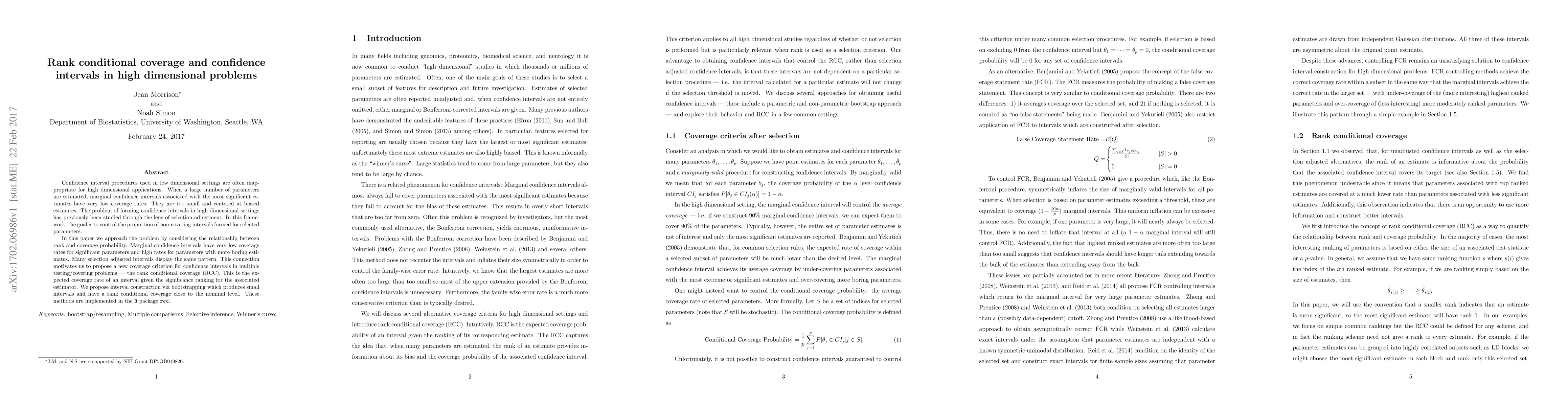 Confidence interval procedures used in low dimensional settings are often inappropriate for high dimensional applications. When a large number of parameters are estimated, marginal confidence intervals associated with the most significant estimates have very low coverage rates: They are too small and centered at biased estimates. The problem of forming confidence intervals in high dimensional settings has previously been studied through the lens of selection adjustment. In this framework, the goal is to control the proportion of non-covering intervals formed for selected parameters. In this paper we approach the problem by considering the relationship between rank and coverage probability. Marginal confidence intervals have very low coverage rates for significant parameters and high rates for parameters with more boring estimates. Many selection adjusted intervals display the same pattern. This connection motivates us to propose a new coverage criterion for confidence intervals in multiple testing/covering problems --- the rank conditional coverage (RCC). This is the expected coverage rate of an interval given the significance ranking for the associated estimator. We propose interval construction via bootstrapping which produces small intervals and have a rank conditional coverage close to the nominal level. These methods are implemented in the R package rcc.