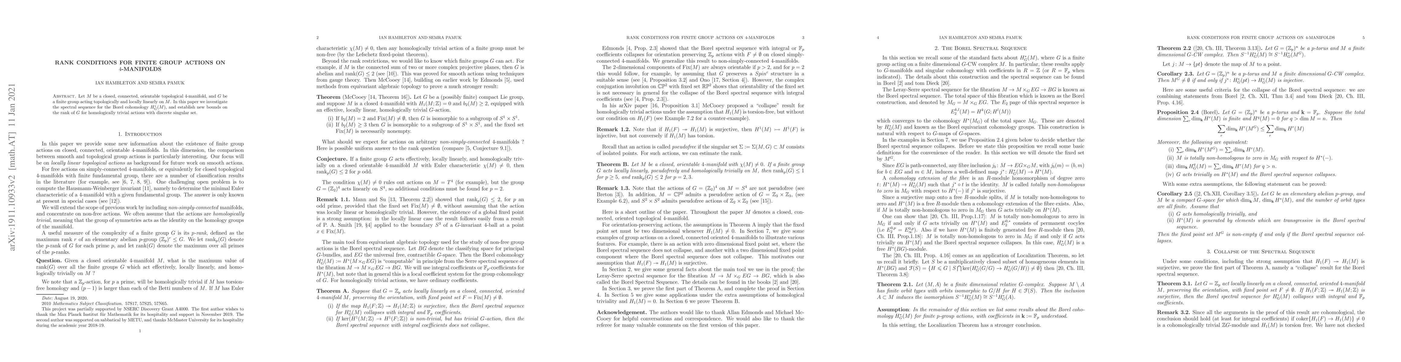 This paper studies the action of finite groups on 4-dimensional topological manifolds, focusing on the Borel spectral sequence for equivariant cohomology. It introduces new bounds for the rank of the group G when the action is homologically trivial and has a discrete singular set.