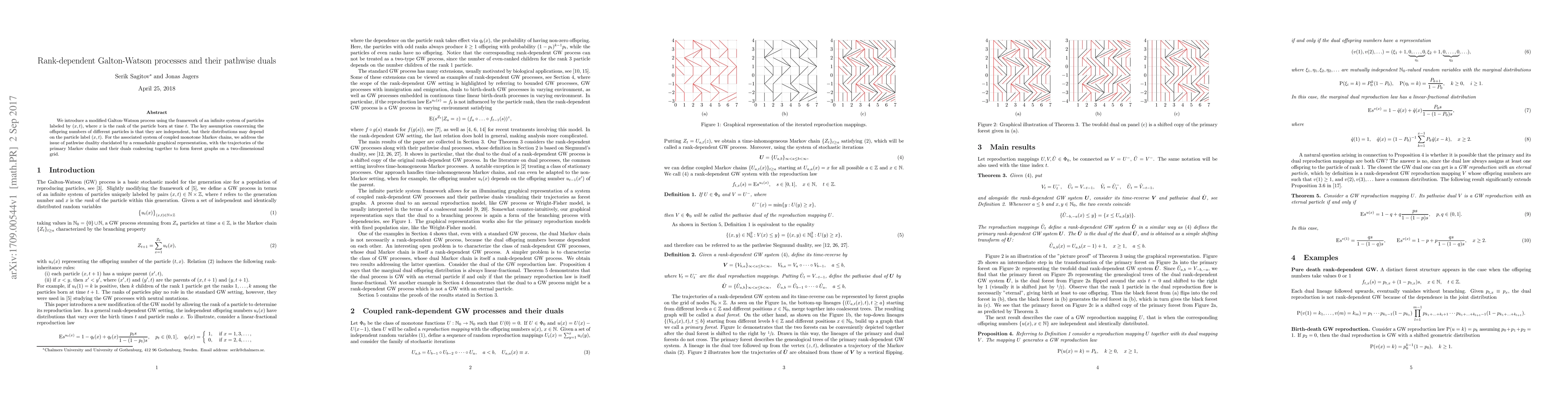 Summary: This paper presents a modified Galton-Watson process where offspring distributions depend on particle rank, introducing pathwise duality through coupled monotone Markov chains that graphically coalesce into forest graphs on a two-dimensional grid.