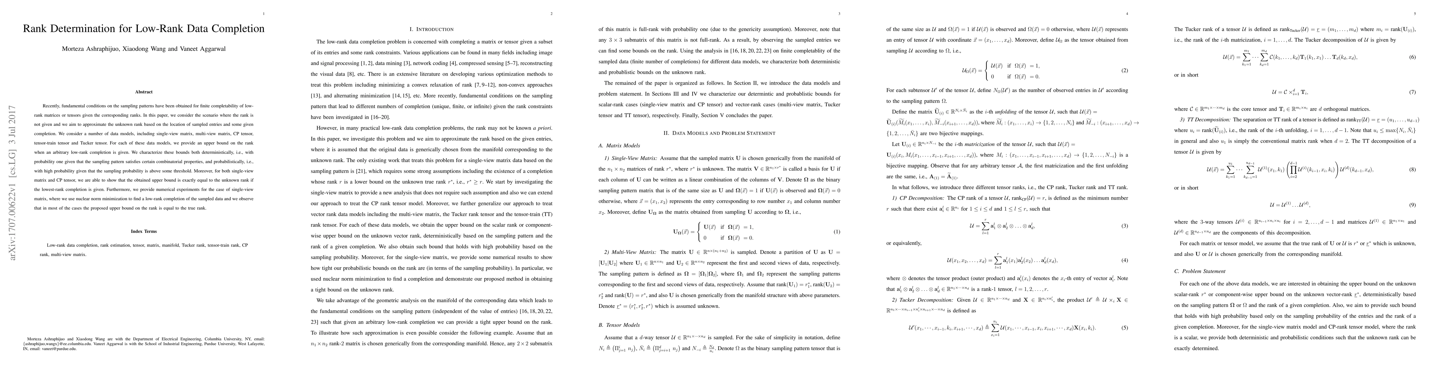 This paper explores methods to approximate the unknown rank of low-rank matrices and tensors based on sampled entries and given completions, providing upper bounds for various data models. It demonstrates that the derived bounds are exact for single-view matrices and CP tensors under certain conditions, and validates the approach through numerical experiments.