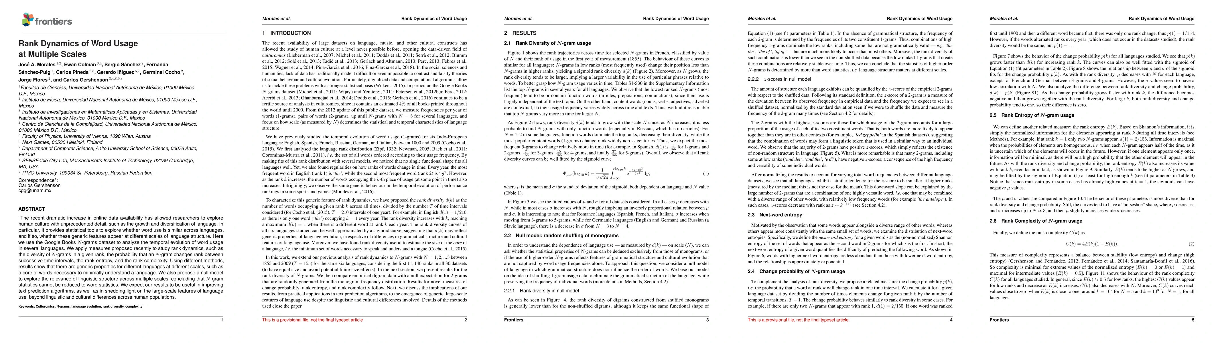 The recent dramatic increase in online data availability has allowed researchers to explore human culture with unprecedented detail, such as the growth and diversification of language. In particular, it provides statistical tools to explore whether word use is similar across languages, and if so, whether these generic features appear at different scales of language structure. Here we use the Google Books $N$-grams dataset to analyze the temporal evolution of word usage in several languages. We apply measures proposed recently to study rank dynamics, such as the diversity of $N$-grams in a given rank, the probability that an $N$-gram changes rank between successive time intervals, the rank entropy, and the rank complexity. Using different methods, results show that there are generic properties for different languages at different scales, such as a core of words necessary to minimally understand a language. We also propose a null model to explore the relevance of linguistic structure across multiple scales, concluding that $N$-gram statistics cannot be reduced to word statistics. We expect our results to be useful in improving text prediction algorithms, as well as in shedding light on the large-scale features of language use, beyond linguistic and cultural differences across human populations.