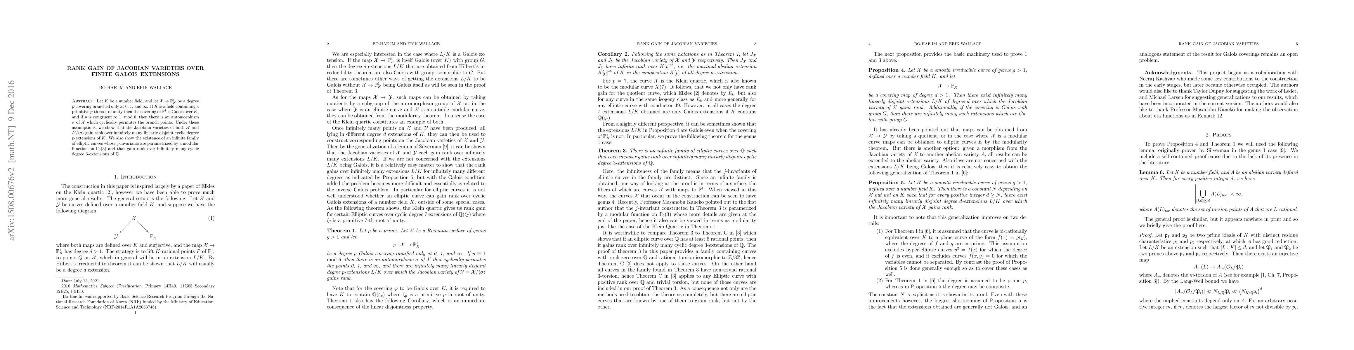 This paper demonstrates the existence of infinitely many degree $d$-extensions over a number field $K$ where the Jacobian of a Riemann surface $\mathcal{X}$ gains rank, particularly when $\mathcal{X}$ is the Klein quartic or an elliptic curve. It also applies this result to show infinitely many elliptic curves gaining rank over cyclic cubic extensions.