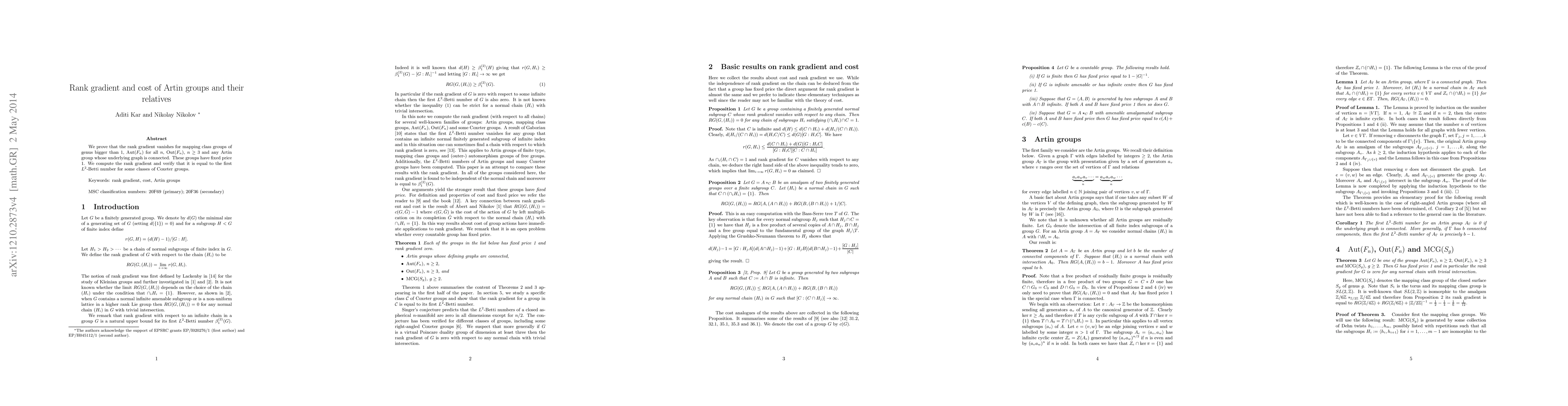 We prove that the rank gradient vanishes for mapping class groups of genus bigger than 1, $Aut(F_n)$, for all $n$, $Out(F_n)$ for $n \geq 3$, and any Artin group whose underlying graph is connected. These groups have fixed price 1. We compute the rank gradient and verify that it is equal to the first $L^2$-Betti number for some classes of Coxeter groups.