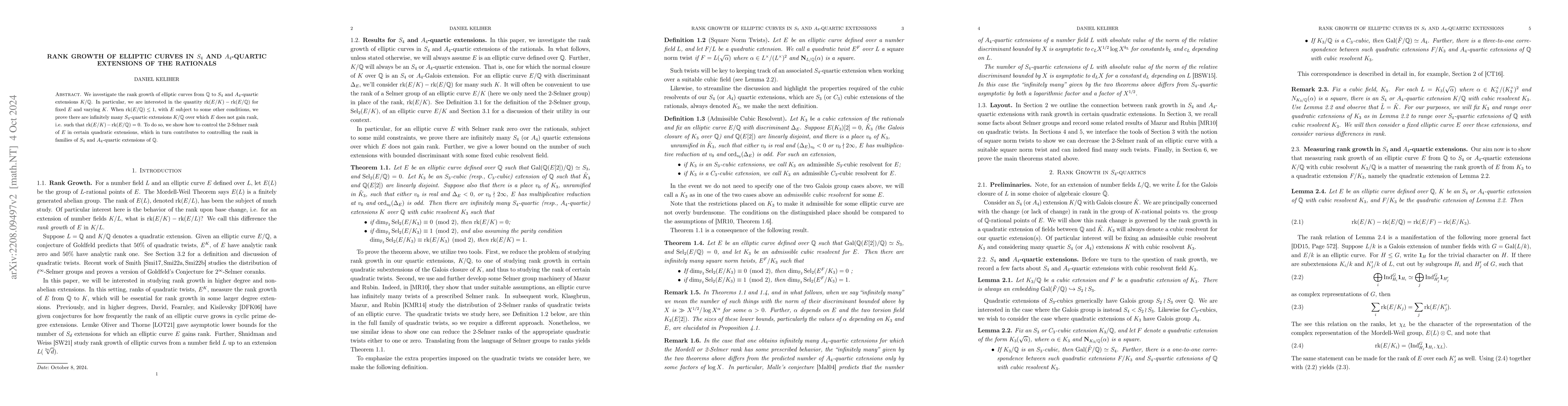 We investigate the rank growth of elliptic curves from $\mathbb{Q}$ to $S_4$ and $A_4$ quartic extensions $K/\mathbb{Q}$. In particular, we are interested in the quantity $\mathrm{rk}(E/K) - \mathrm{rk}(E/\mathbb{Q})$ for fixed $E$ and varying $K$. When $\mathrm{rk}(E/\mathbb{Q}) \leq 1$, with $E$ subject to some other conditions, we prove there are infinitely many $S_4$ quartic extensions $K/\mathbb{Q}$ over which $E$ does not gain rank, i.e. such that $\mathrm{rk}(E/K) - \mathrm{rk}(E/\mathbb{Q}) = 0$. To do so, we show how to control the 2-Selmer rank of $E$ in certain quadratic extensions, which in turn contributes to controlling the rank in families of $S_4$ and $A_4$ quartic extensions of $\mathbb{Q}$.