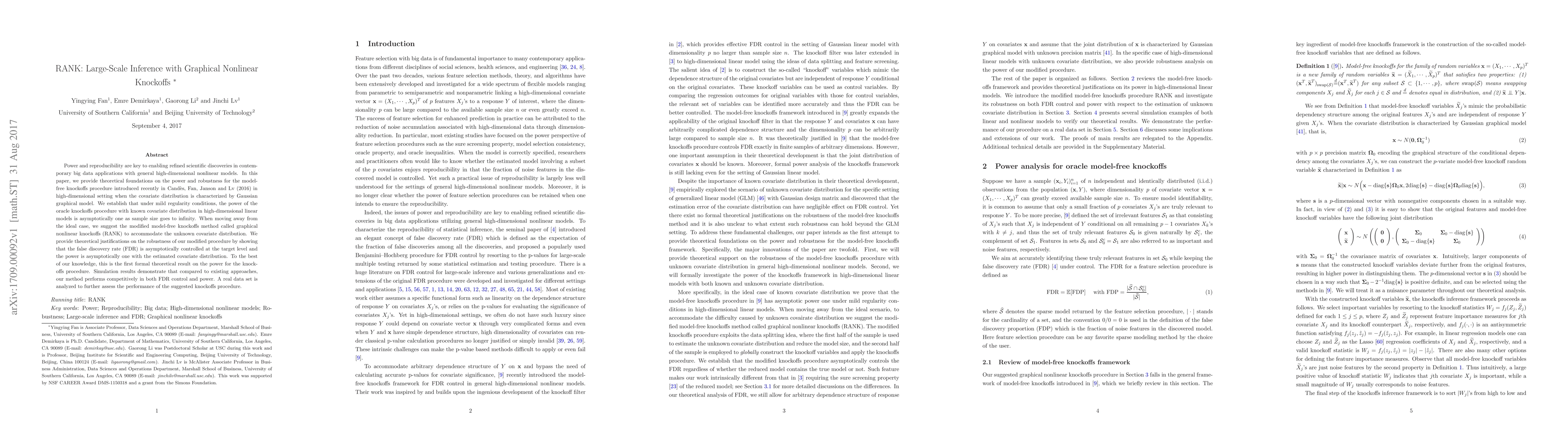 This paper introduces the RANK method for large-scale inference in high-dimensional nonlinear models, providing theoretical foundations for its robustness and power. It demonstrates that the graphical nonlinear knockoffs method effectively controls the false discovery rate and achieves high power even with unknown covariate distributions.