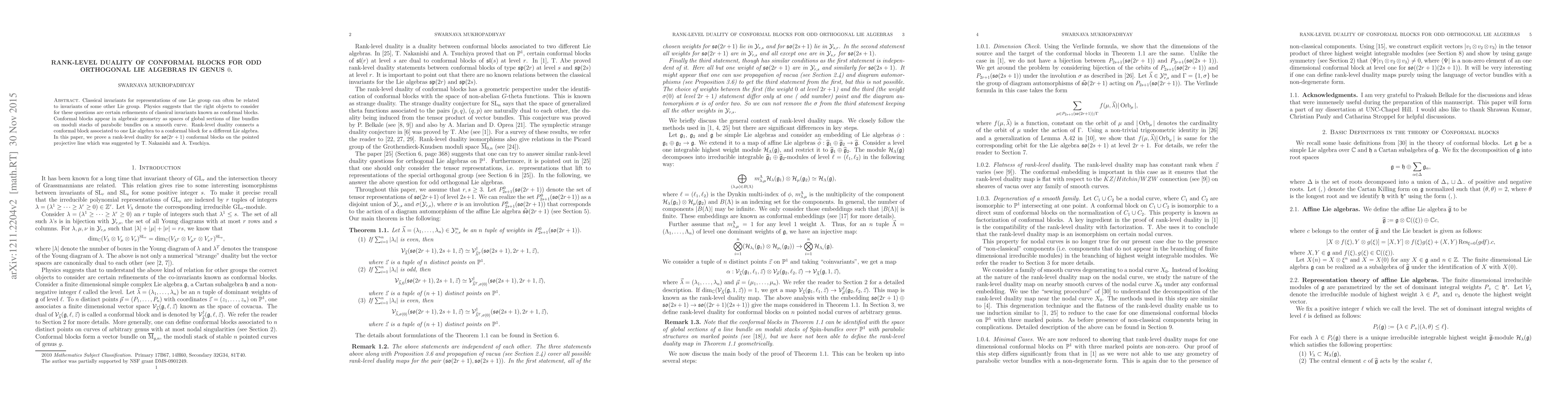 This paper establishes rank-level duality for conformal blocks associated with odd orthogonal Lie algebras of type so(2r+1) on genus 0 Riemann surfaces, confirming a conjecture by T. Nakanishi and A. Tsuchiya. The study ties classical Lie group invariants to conformal blocks in algebraic geometry.