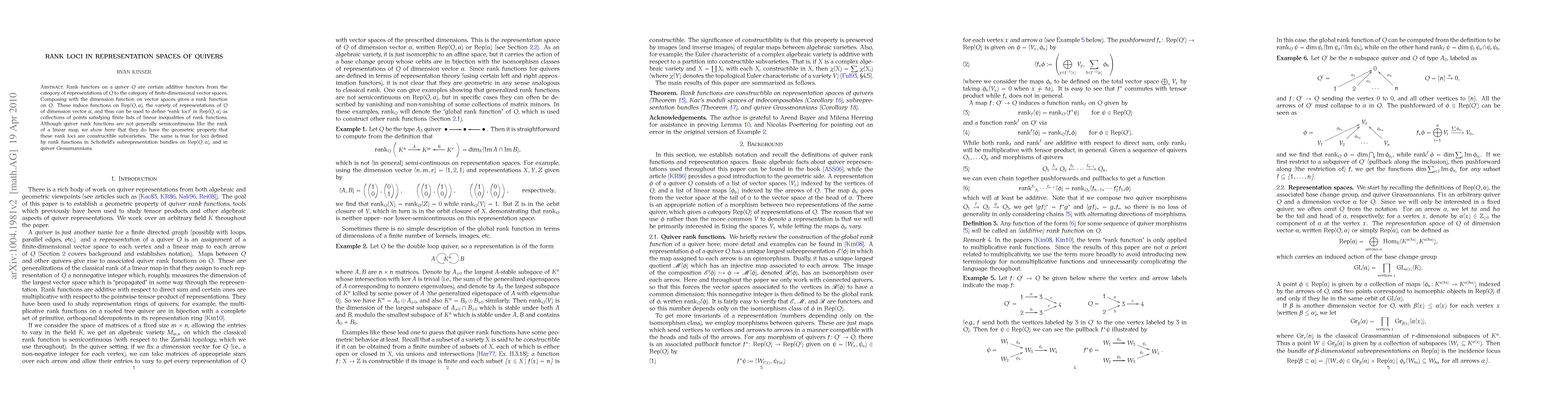 This paper investigates rank loci in representation spaces of quivers, showing that these loci, defined by collections of points satisfying linear inequalities of rank functions, are constructible subvarieties. It also extends this result to rank loci in Schofield's subrepresentation bundles and quiver Grassmannians.