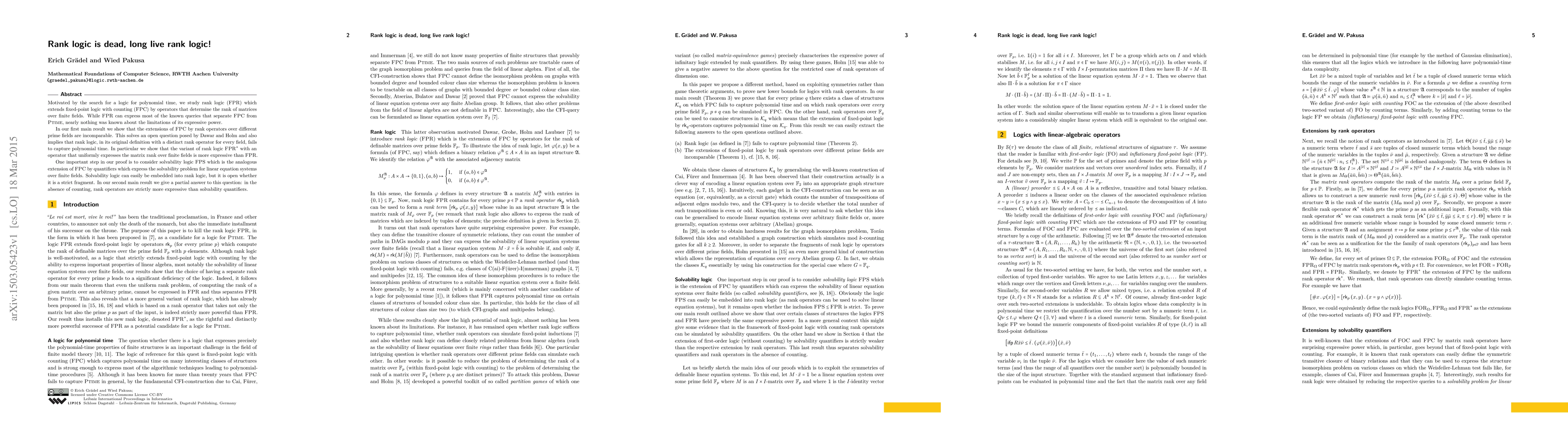 This paper investigates rank logic (FPR), an extension of fixed-point logic with counting that includes matrix rank operators over finite fields. The authors demonstrate that extensions of FPC by rank operators over different prime fields are incomparable, showing that rank logic fails to capture polynomial time. They also prove that rank logic with a uniform rank operator (FPR*) is more expressive than the original rank logic, and establish that rank operators are strictly more powerful than solvability quantifiers in the absence of counting.