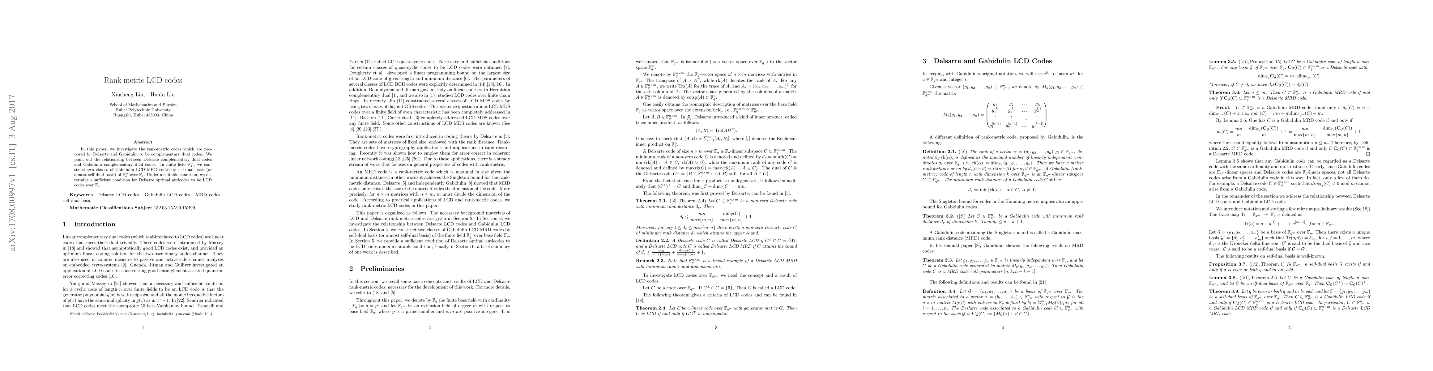 In this paper, we investigate the rank-metric codes which are proposed by Delsarte and Gabidulin to be complementary dual codes. We point out the relationship between Delsarte complementary dual codes and Gabidulin complementary dual codes. In finite field $\mathbb{F}_{q}^{m}$, we construct two classes of Gabidulin LCD MRD codes by self-dual basis (or almost self-dual basis) of $\mathbb{F}_{q}^{m}$ over $\mathbb{F}_{q}$. Under a suitable condition, we determine a sufficient condition for Delsarte optimal anticodes to be LCD codes over $\mathbb{F}_{q}$.