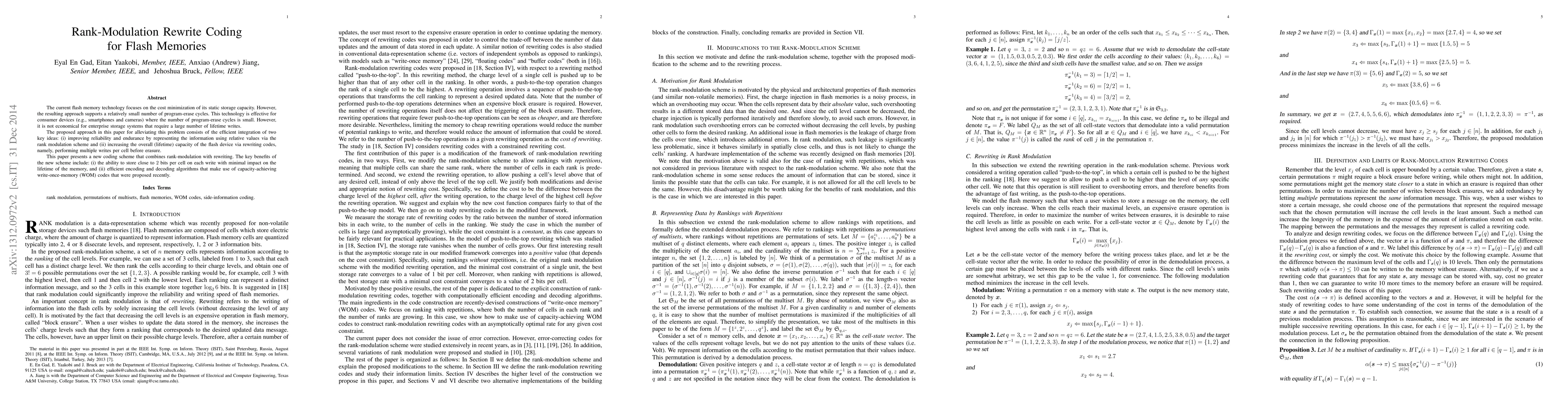 This paper proposes a rank-modulation rewrite coding scheme to enhance the reliability and endurance of flash memories, enabling higher storage capacity and more program-erase cycles. The new coding method stores nearly 2 bits per cell with minimal impact on memory lifetime, leveraging efficient encoding and decoding algorithms based on recent write-once-memory codes.