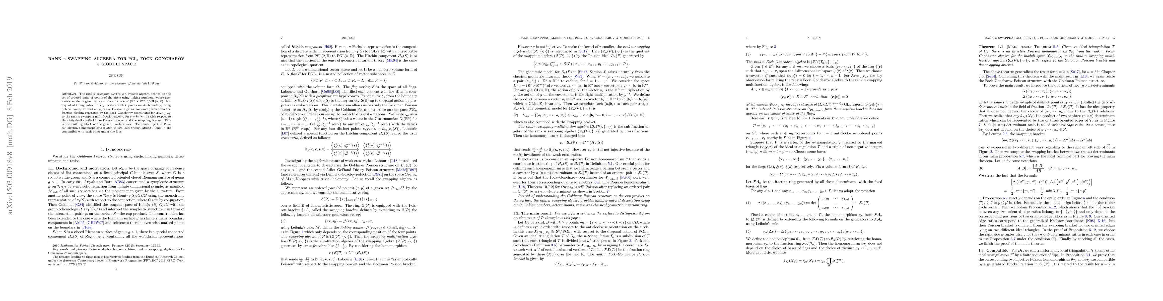 The {\em rank $n$ swapping algebra} is a Poisson algebra defined on the set of ordered pairs of points of the circle using linking numbers, whose geometric model is given by a certain subspace of $(\mathbb{K}^n \times \mathbb{K}^{n*})^r/\operatorname{GL}(n,\mathbb{K})$. For any ideal triangulation of $D_k$---a disk with $k$ points on its boundary, using determinants, we find an injective Poisson algebra homomorphism from the fraction algebra generated by the Fock--Goncharov coordinates for $\mathcal{X}_{\operatorname{PGL}_n,D_k}$ to the rank $n$ swapping multifraction algebra for $r=k\cdot(n-1)$ with respect to the (Atiyah--Bott--)Goldman Poisson bracket and the swapping bracket. This is the building block of the general surface case. Two such injective Poisson algebra homomorphisms related to two ideal triangulations $\mathcal{T}$ and $\mathcal{T}'$ are compatible with each other under the flips.