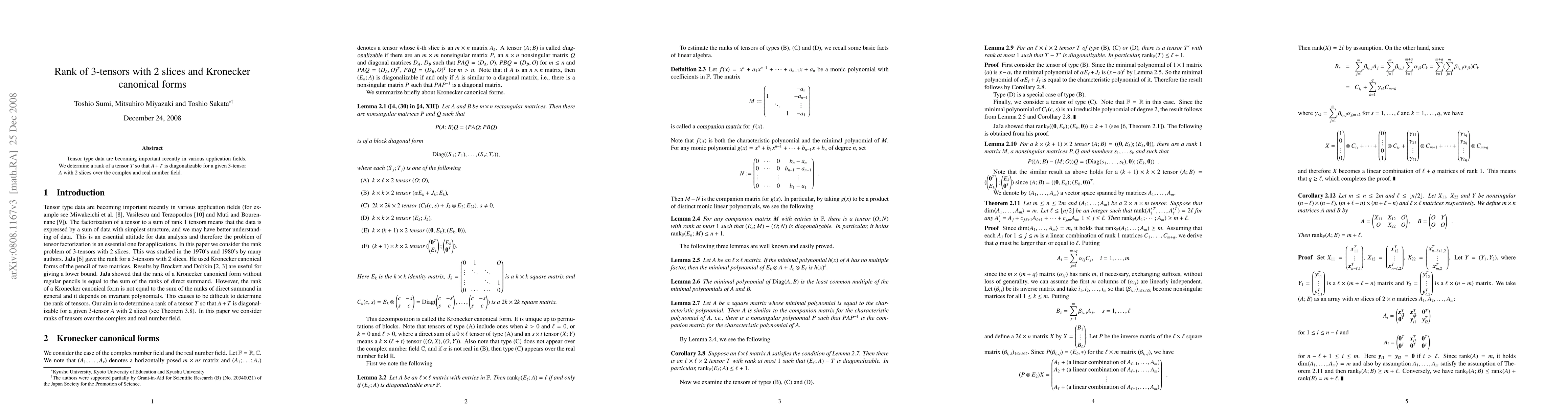 Tensor type data are becoming important recently in various application fields. We determine a rank of a tensor T so that A+T is diagonalizable for a given 3-tensor A with 2 slices over the complex and real number field.