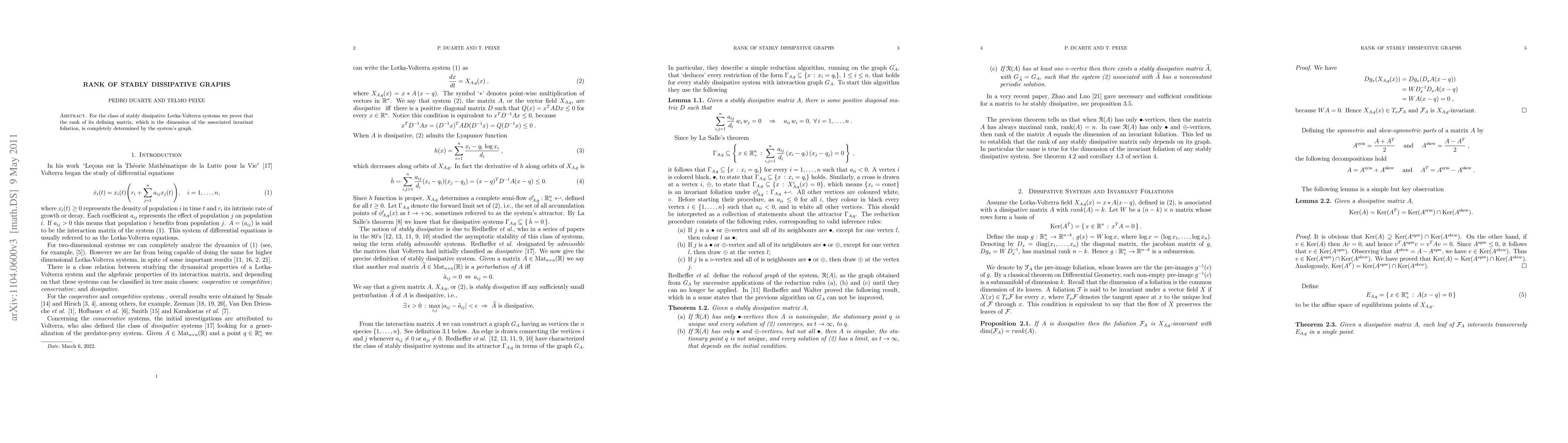 For the class of stably dissipative Lotka-Volterra systems we prove that the rank of its defining matrix, which is the dimension of the associated invariant foliation, is completely determined by the system's graph.