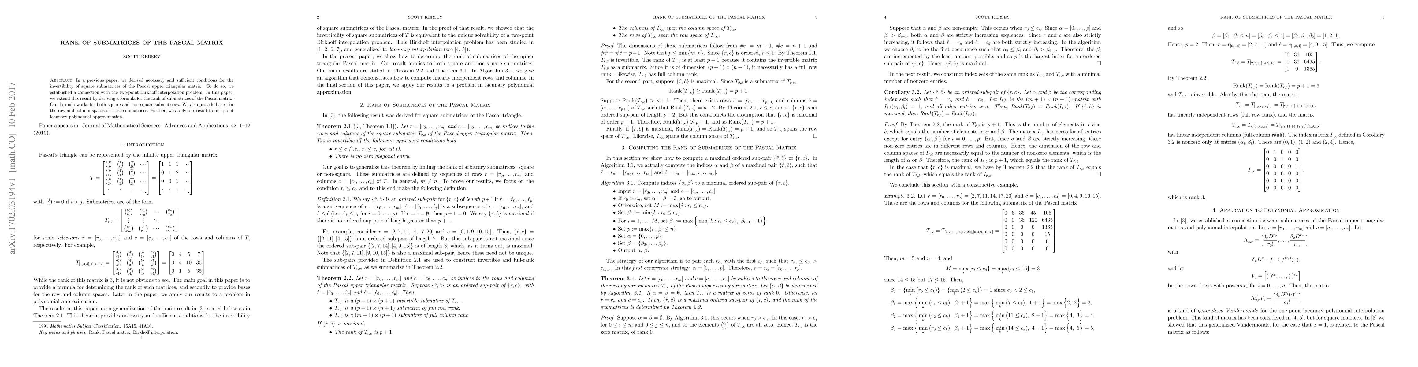 This paper extends previous work on the invertibility of Pascal matrix submatrices by deriving a formula for their rank applicable to both square and non-square submatrices, along with bases for their row and column spaces, and applies these findings to one-point lacunary polynomial approximation.