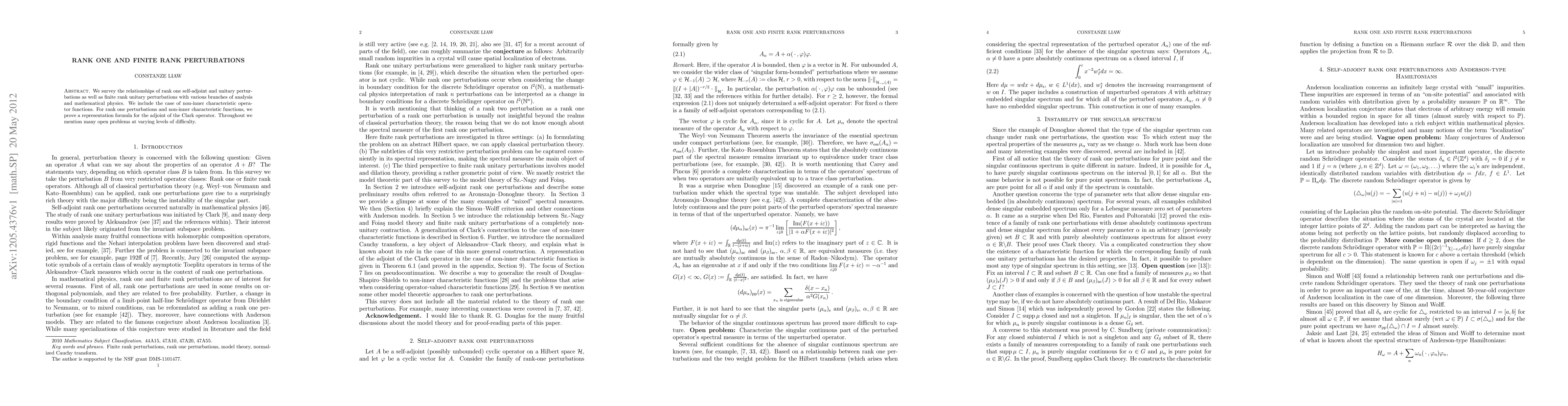 The paper provides a survey of rank one and finite rank unitary perturbations, examining their relationships with various branches of analysis and mathematical physics. It includes representation formulas and discusses open problems.