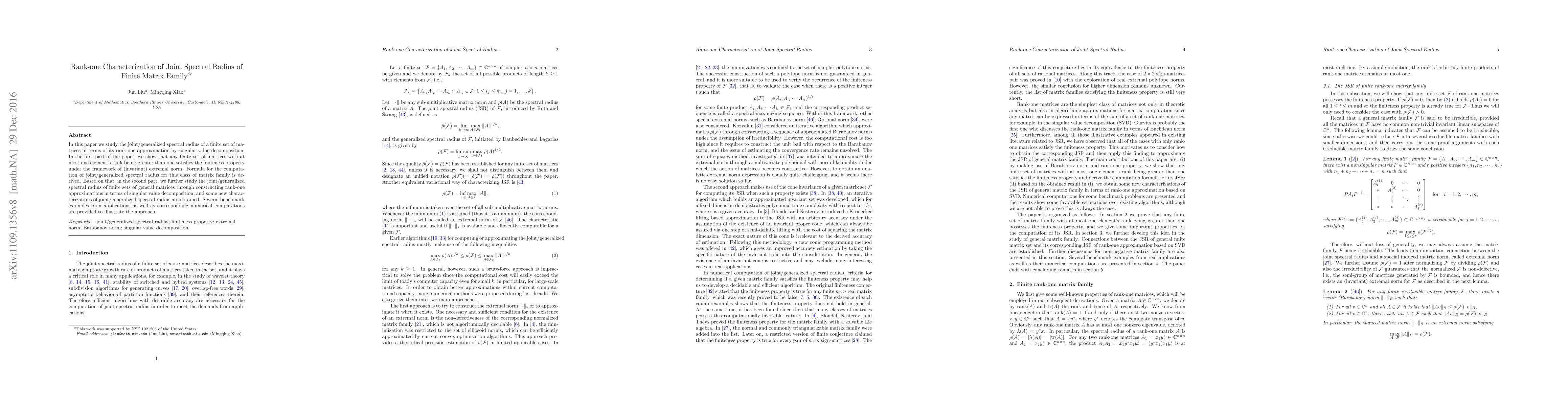 This paper investigates the joint spectral radius of finite matrix families using rank-one approximations via singular value decomposition. It establishes a finiteness property for sets where most matrices have rank ≤ 1, and derives a formula for their joint spectral radius. Further, it extends the analysis to general matrices, providing new characterizations and illustrating the method with examples and numerical computations.