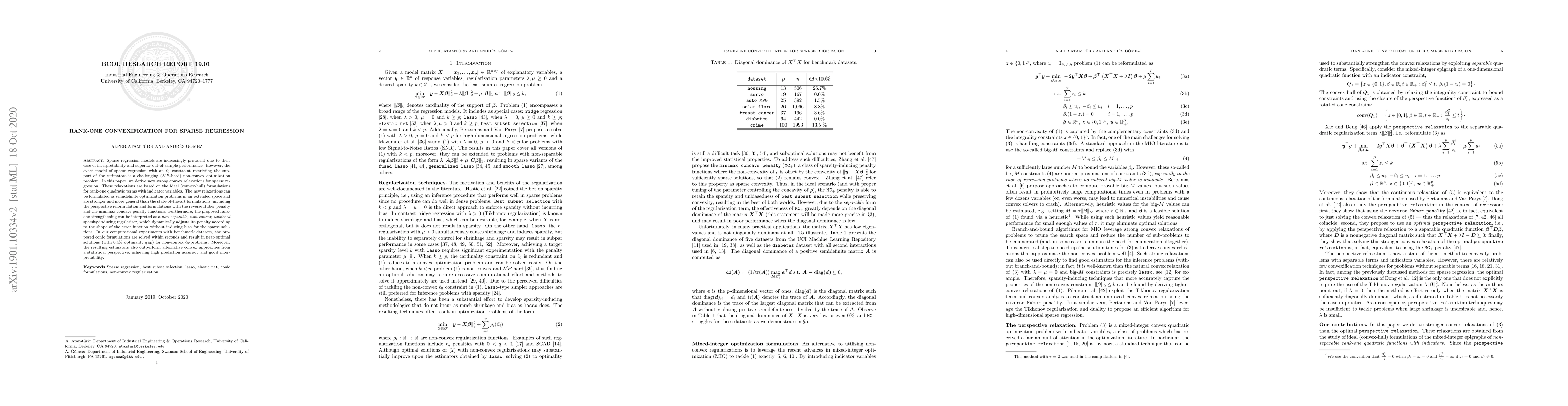 This paper introduces novel strong convex relaxations for sparse regression based on rank-one quadratic terms, formulated as semidefinite optimization problems. These new relaxations outperform existing methods, dynamically adjusting penalties for sparsity without bias, and achieve near-optimal solutions with high prediction accuracy and interpretability.