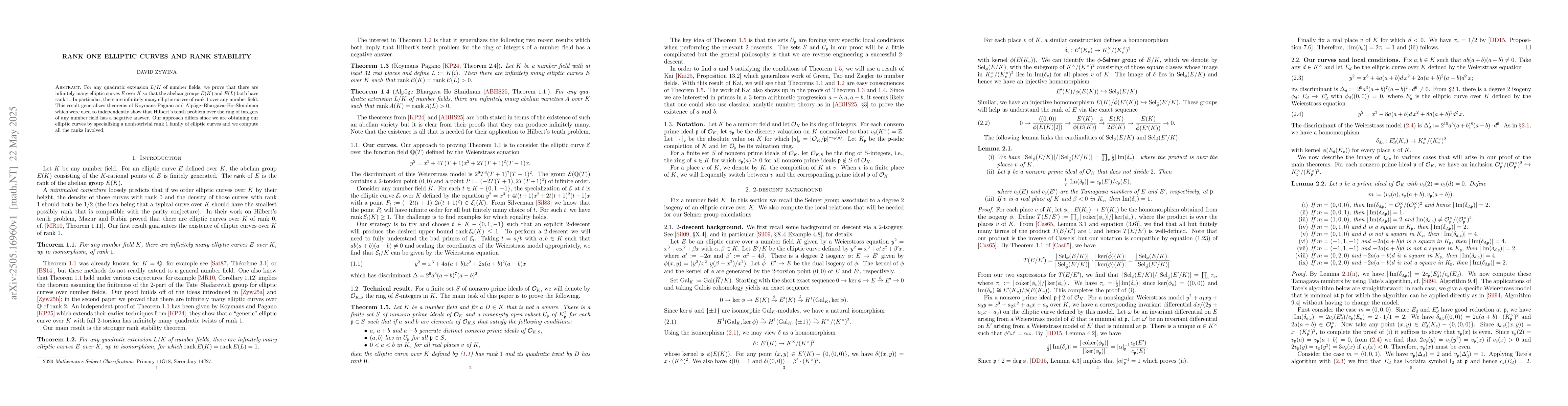 The research proves the existence of infinitely many elliptic curves E over a number field K with rank 1 in their K and L (a quadratic extension of K) groups, by specializing a nonisotrivial rank 1 elliptic curve family and computing all ranks involved.