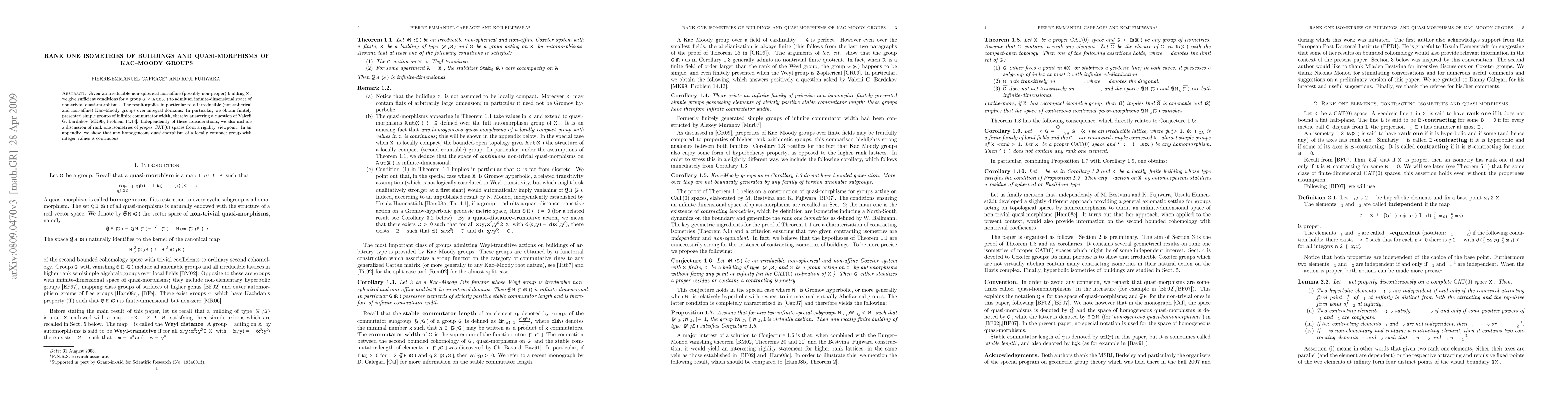 Given an irreducible non-spherical non-affine (possibly non-proper) building $X$, we give sufficient conditions for a group $G < \Aut(X)$ to admit an infinite-dimensional space of non-trivial quasi-morphisms. The result applies to all irreducible (non-spherical and non-affine) Kac-Moody groups over integral domains. In particular, we obtain finitely presented simple groups of infinite commutator width, thereby answering a question of Valerii G. Bardakov from the Kourovka notebook. Independently of these considerations, we also include a discussion of rank one isometries of proper CAT(0) spaces from a rigidity viewpoint. In an appendix, we show that any homogeneous quasi-morphism of a locally compact group with integer values is continuous.